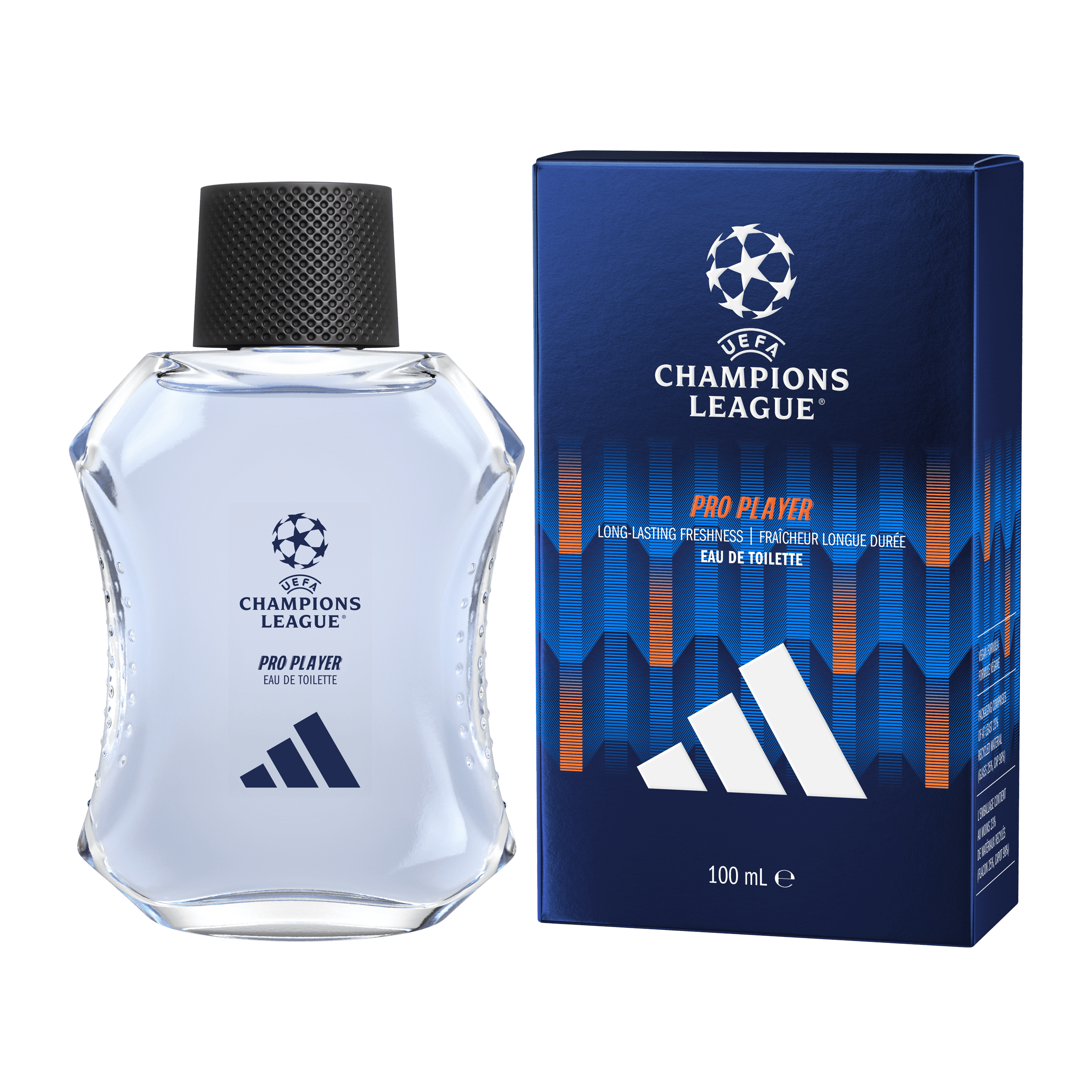 Adidas UEFA Champions League PRO PLAYER Edition Eau de Toilette heiðrar leikmanninn sem breytir hverri snertingu í meistaraverk. Langvarandi, ferskur ilmur með náttúrulegum ilmkjarnaolíum úr svörtum pipar og tónum af lavender. Þróaður með „all day fresh“ tækni. Kryddaður og ilmjurtakenndur ilmur með vegan formúlu. Umbúðirnar eru að minnsta kosti 23% úr endurunnu efni: flaskan er úr 25% endurunnu efni og lokið úr 98%.