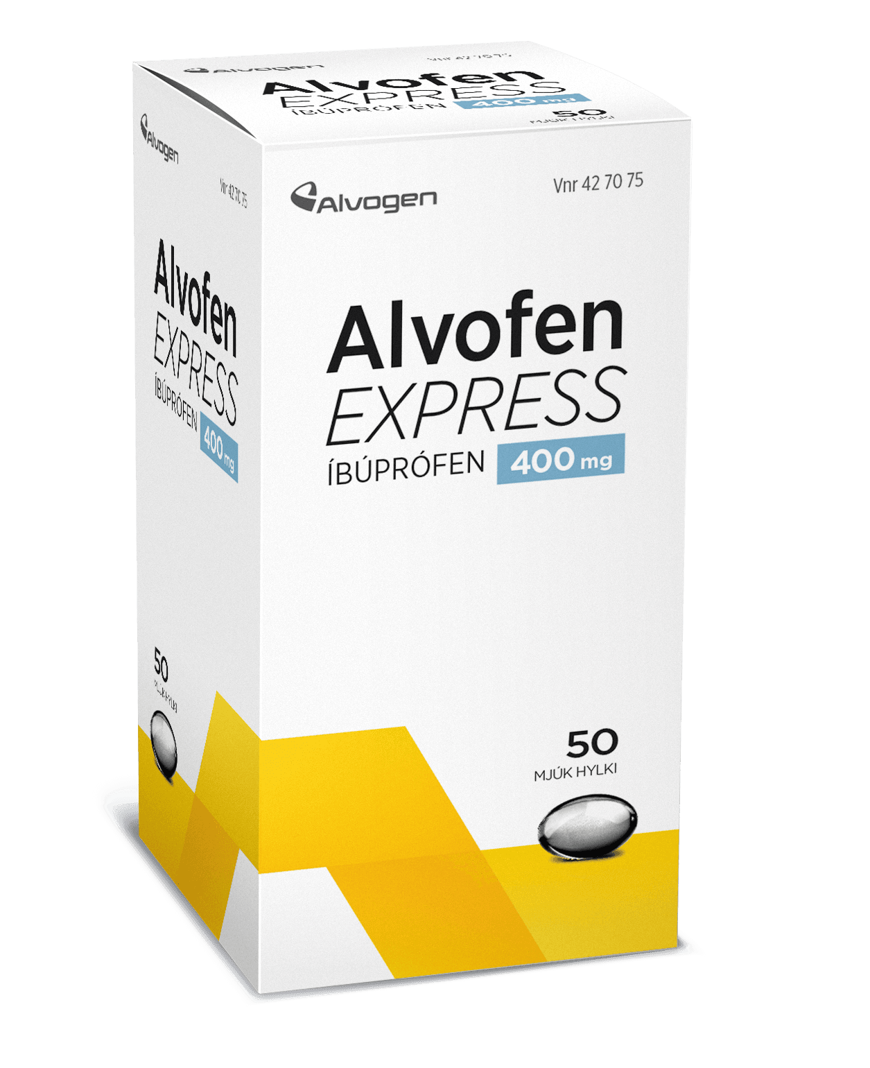 Við verkjum, bólgum og hita. Virka efnið er íbúprófen 400 mg. Mjúk hylki til inntöku. Alvofen Express virkar hraðar en íbúprófen töflur. Virka efnið er uppleyst í hylkinu og frásogast því hraðar.