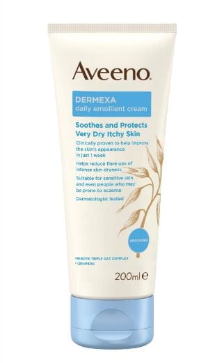 "Aveeno Dermexa rakakrem róar, verndar og dregur úr kláða vegna þurrar húðar. Það veitir raka og hjálpar til við að draga úr útbrotum. Bætt útlit húðar á aðeins einni viku hefur verið staðfest í klínískum rannsóknum.