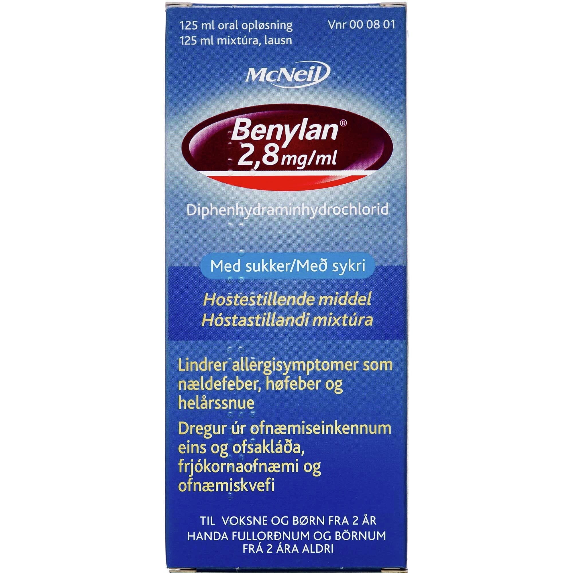 Skammtar Fullorðnir: 10 ml 3-5 sinnum á sólarhring. Börn 6-15 ára: 5 ml 3-5 sinnum á sólarhring. Börn 2-5 ára: 2,5 ml 3-5 sinnum á sólarhring. Þú mátt eingöngu gefa börnum yngri en tveggja ára Benylan samkvæmt læknisráði. Lyfið á ekki að gefa börnum yngri en 4 ára sem hóstastillandi lyf. Lesið vandlega upplýsingar á umbúðum og fylgiseðli fyrir notkun lyfsins. Leitið til læknis eða lyfjafræðings sé þörf á frekari upplýsingum um áhættu og aukaverkanir. Sjá nánari upplýsingar um lyfið á sérlyfjaskrá