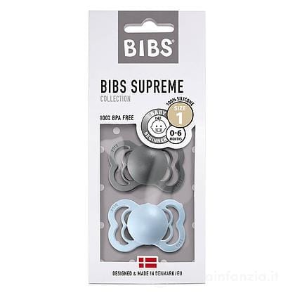BIBS Supreme snuðin eru með fiðrilda laga skjöld. Túttan er flöt og úr siliconi. Túttan er mótuð til þess að draga úr þrýstingi á tönnum og kjálka. Koma í mörgum litum og tveirum stærðum, 0 mán+ og 6 mán+. Koma tvö saman í pakka.