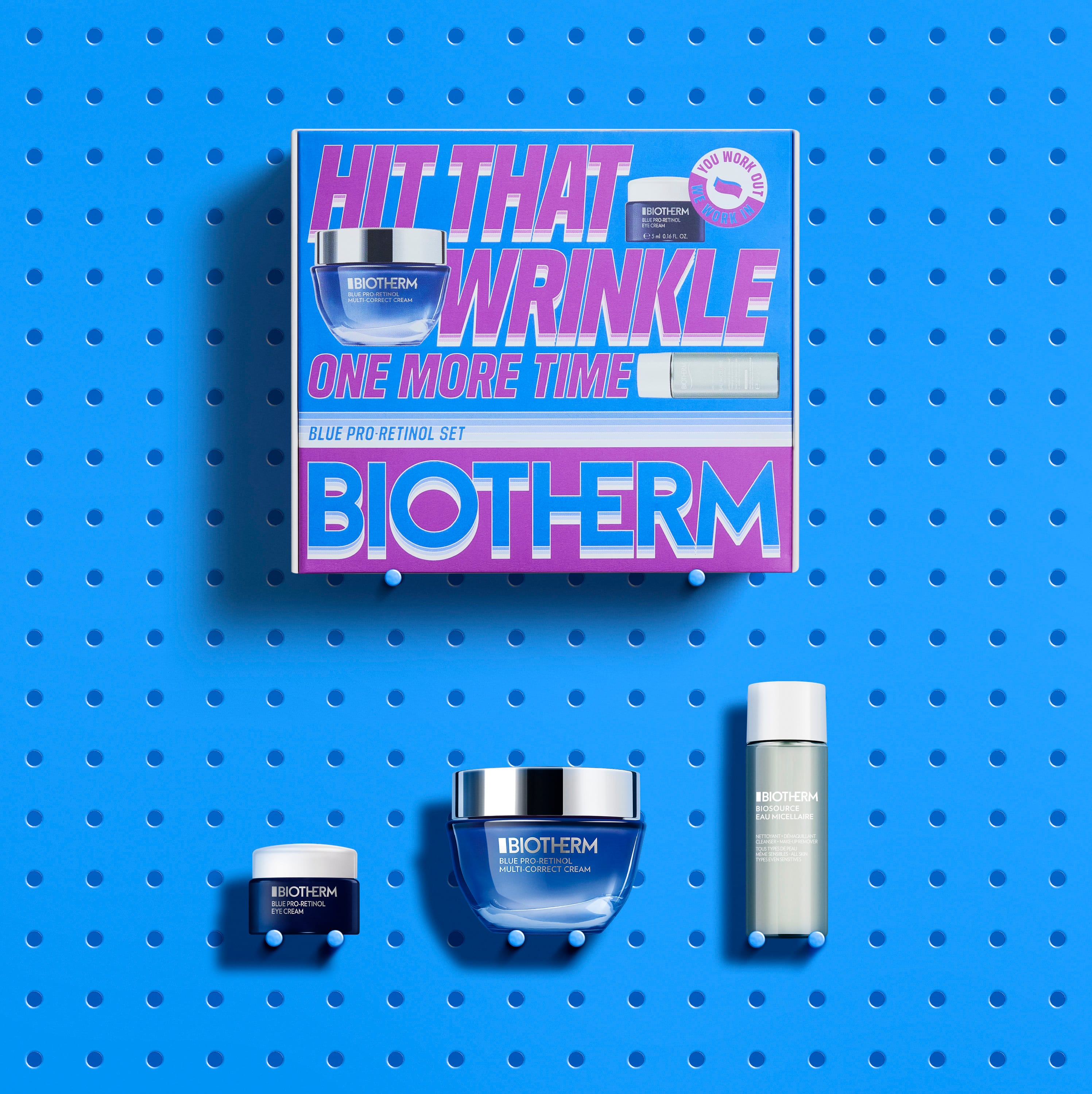 Biotherm Blue Pro Retinol Set 2026 inniheldur Blue Pro-Retinol Moisturizing Cream 50 ml, Biosource Eau Micellaire 30 ml og Blue Pro-Retinol Eye Cream 5 ml.