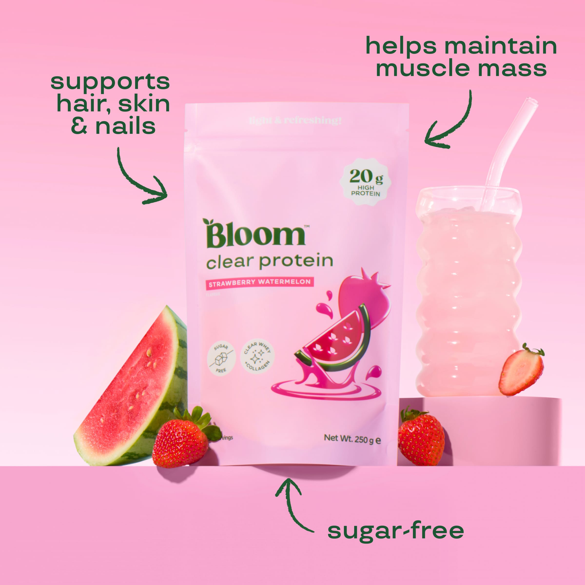 Bloom Clear Protein formúlan samanstendur af mysupróteinu sem styður við vöðvauppbyggingu og collagen peptíðum sem styðja við heilbrigt hár, húð og neglur. Létt og fersk formúlu sem blandast vel. 20 gr af próteinu í hverjum skammti. Án viðbætts sykurs