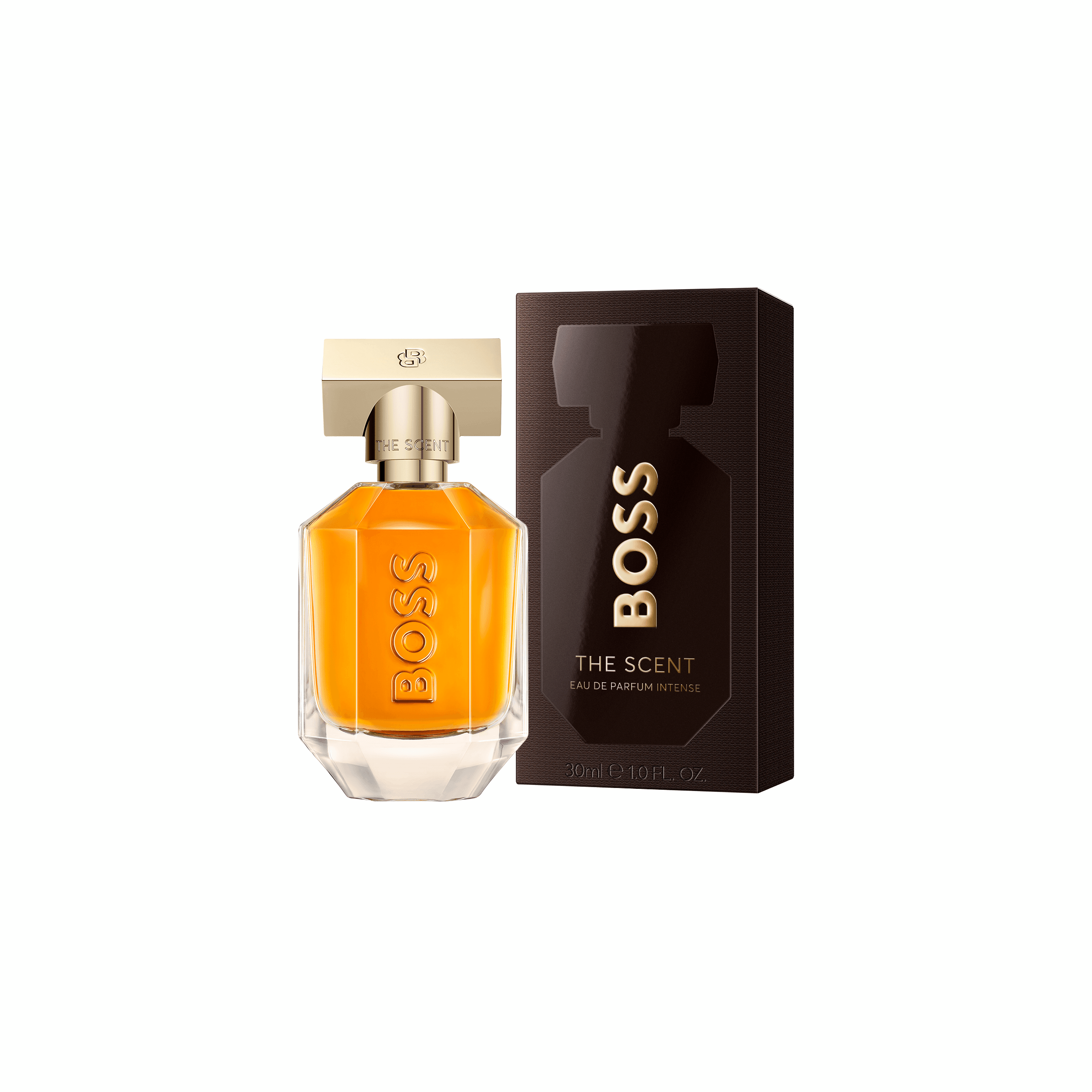 BOSS The Scent Eau de Parfum Intense for Her endurskilgreinir The Scent ilminn í áhrifamikilli flösku, skreytt með gylltum tappa og tvöföldu B monogrammi. Í gegnum lögun flöskunnar glóir gull amber litaður vökvinn eins og bráðið hunang og endurspeglar kraftmikinn samruna í fullkomnu jafnvægi.