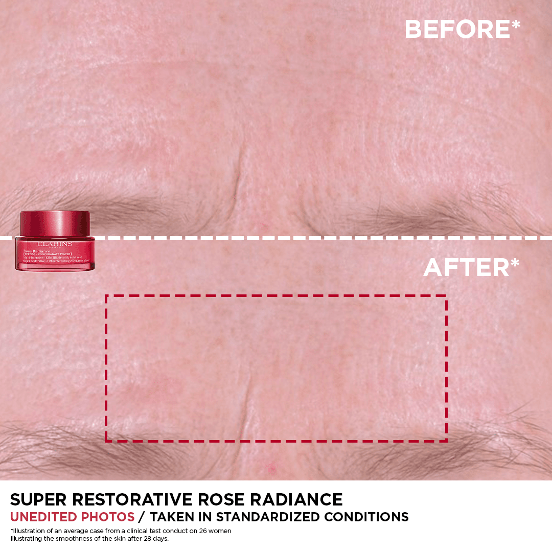 Ljómaaukandi dagkrem sem er viðbót við Super Restorative-línuna, en hún er hönnuð fyrir húð sem glímir við aldurstengdar hormónabreytingar. Rannsóknarstofur Clarins hafa sameinað öflugustu ljómaaukandi innihaldsefnin saman við einstaka plöntukjarna til að endurnæra, endurnýja og fegra húðina. Dag eftir dag endurheimtir húðin náttúrulegan og rósalitaðan ljóma sinn. Clarins sameinar þrjú sérvalin innihaldsefni fyrir ljómaaukandi áhrif til að færa húðinni þrjár víddir af útgeislun: ljómandi húð, jafn húðtónn og slétt áferð. Blanda sjö plöntukjarna endurlífgar ungleika og ljóma húðarinnar. Einstök áferð sem gengur auðveldlega inn í húðina og gerir hana samstundis ljómameiri.