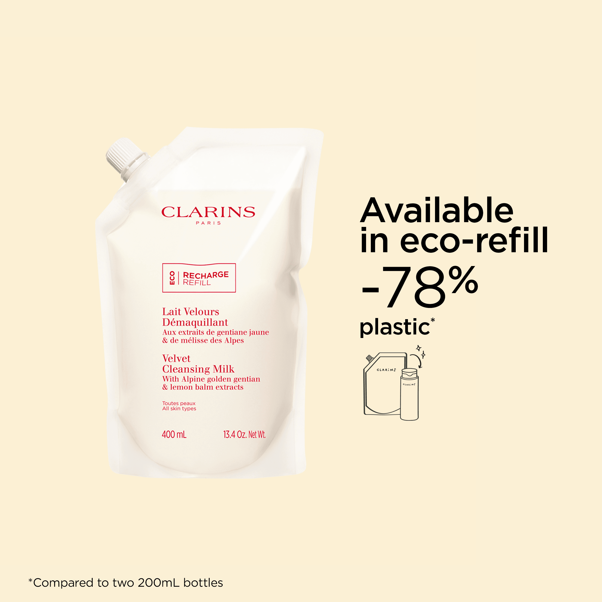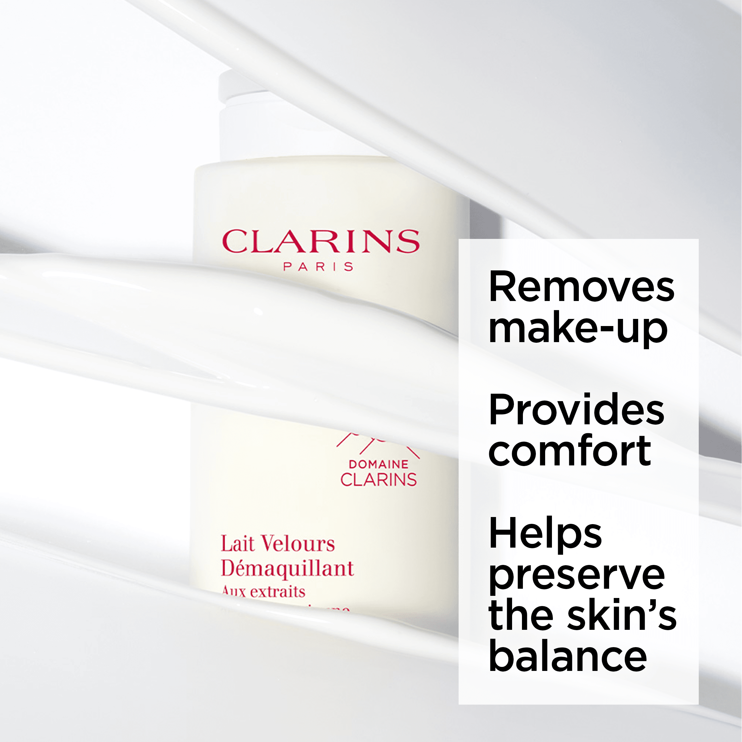Þessi kremkennda hreinsimjólk er auðguð Gentle Complex frá Le Domaine Clarins (lífrænn gulvöndur og lífræn hjartafró) sem hreinsar og róar húðina án þess að raska jafnvægi hennar. Sjáðu hreinsimeðferð okkar á netinu. Fullkomin með andlitsvatni. 96%* Þægileg húð. 95%* Mjúk og silkikennd húð. 93%* Farði fullkomlega fjarlægður. 99%** Mjúk áferð. 98%** Róandi áferð. 97%** Kremkennd áferð. *Ánægjupróf – 113 konur – eftir 14 daga notkun. *Ánægjupróf – 113 konur – eftir fyrstu ásetningu. Allar húðgerðir, þurr húð.