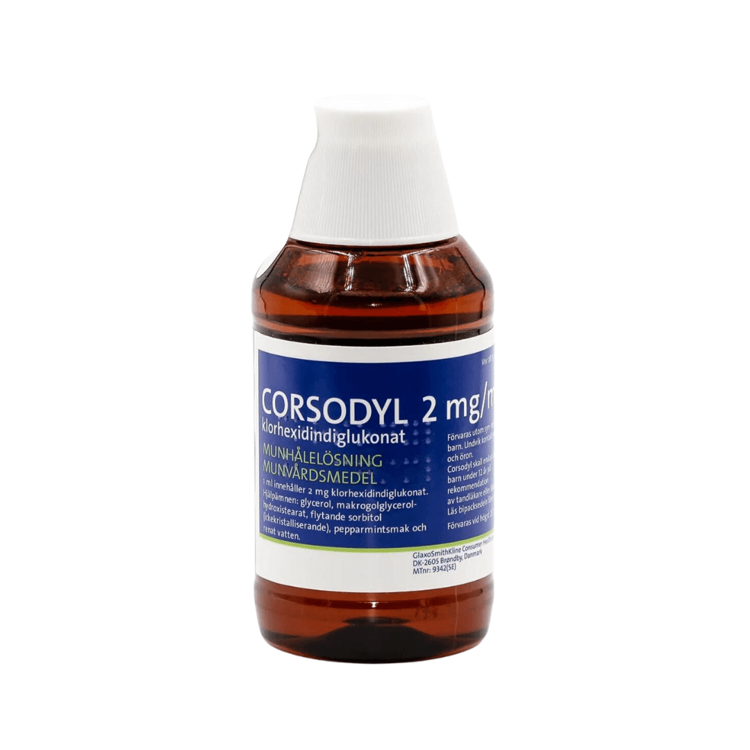 Corsodyl er sótthreinsandi lausn til munnhirðu.