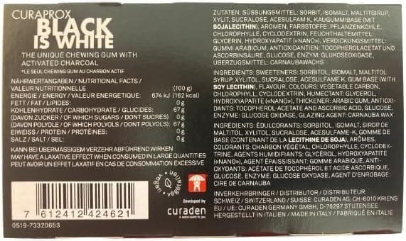 Sorbitol, Isomalt, Maltitol Syrup, Xylitol, Gum Base (with Soy Lecithin), Flavour, Vegetable Carbon, Titanium Dioxide, Chlorophyll, Cyclodextrin, Glycerin, Nano Hydroxylapatite, Arabic Gum, Tocopherol, Ascorbic Acid, D-Glucose, Sucralose, Acesulfame K, Glucose Oxidase, Carnauba Wax.