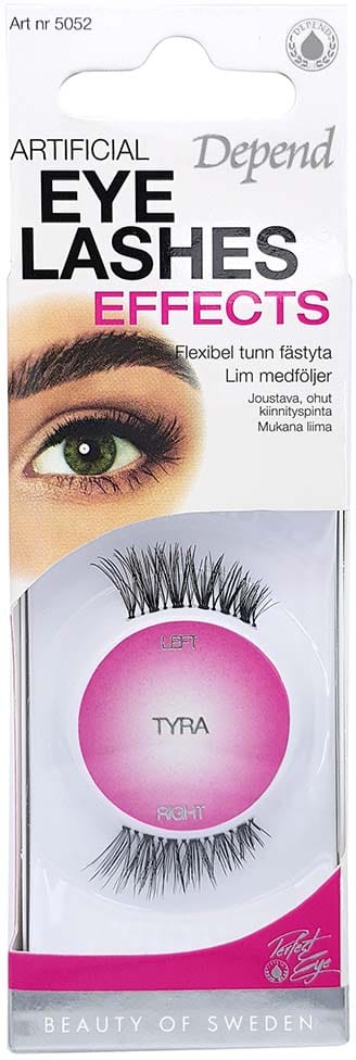 Fullkomnaðu förðunina með fölskum augnhárum frá Depend. Tyra augnhárin eru hálf augnhár sem eru sett á ytri hlutann á augunum til þess að ná meiri fyllingu á ytri hlutanum fyrir skemmtilegt og fallegt útlit. Handgerð úr náttúrulegu hári (ekki úr dýrahárum), Hárin eru sérstaklega valin til þess að tryggja gæði. Augnhárin eru sveigjanleg og einstaklega létt og meðfærileg sem gerir þau þægileg í notkun. Hægt er að nota augnhárin oftar en einu sinni. Í pakkanum fylgir augnháralím án latex, sem er gott fyrir þá sem eru með viðkvæm augu og með ofnæmi. Ítarlegar notkunarleiðbeiningar eru í pakkanum.