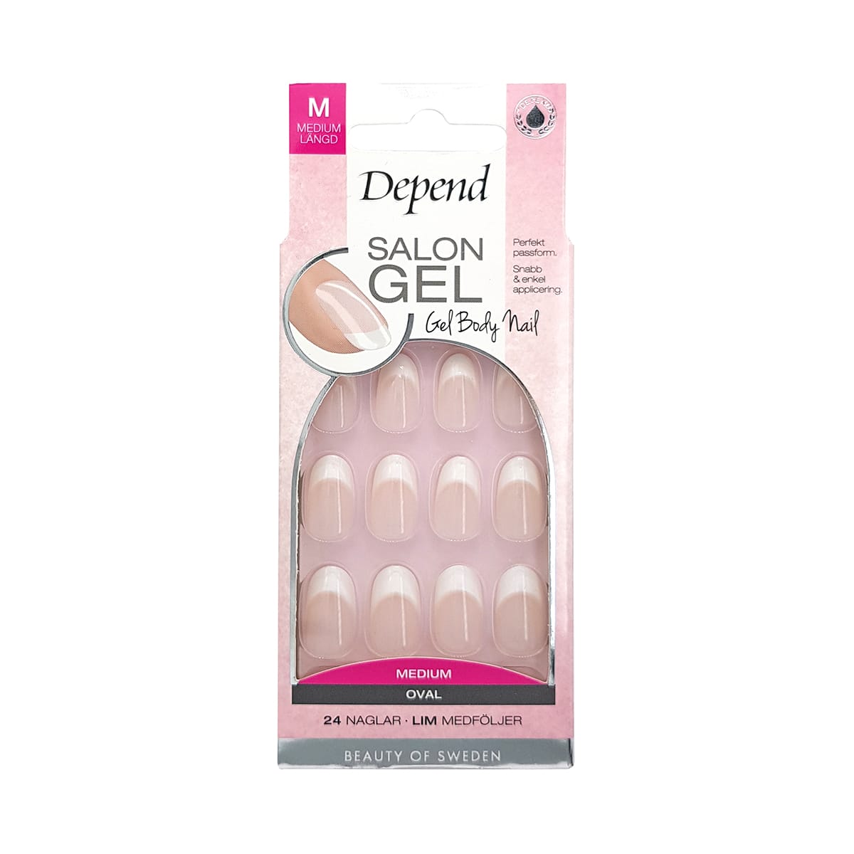 Fallegar gervineglur frá Depend með french hönnun. Gervineglurnar eru þunnar og sveigjanlegar sem gerir ásetningu auðvelda. Útlit gervinaglanna er eins og gelneglur. Neglurnar eru í medium lengd og oval lögun. Í pakkanum eru 24 neglur í nokkrum stærðum. Það fylgir naglalím, lítil naglaþjöl og naglasnyrtipinni með í pakkanum.