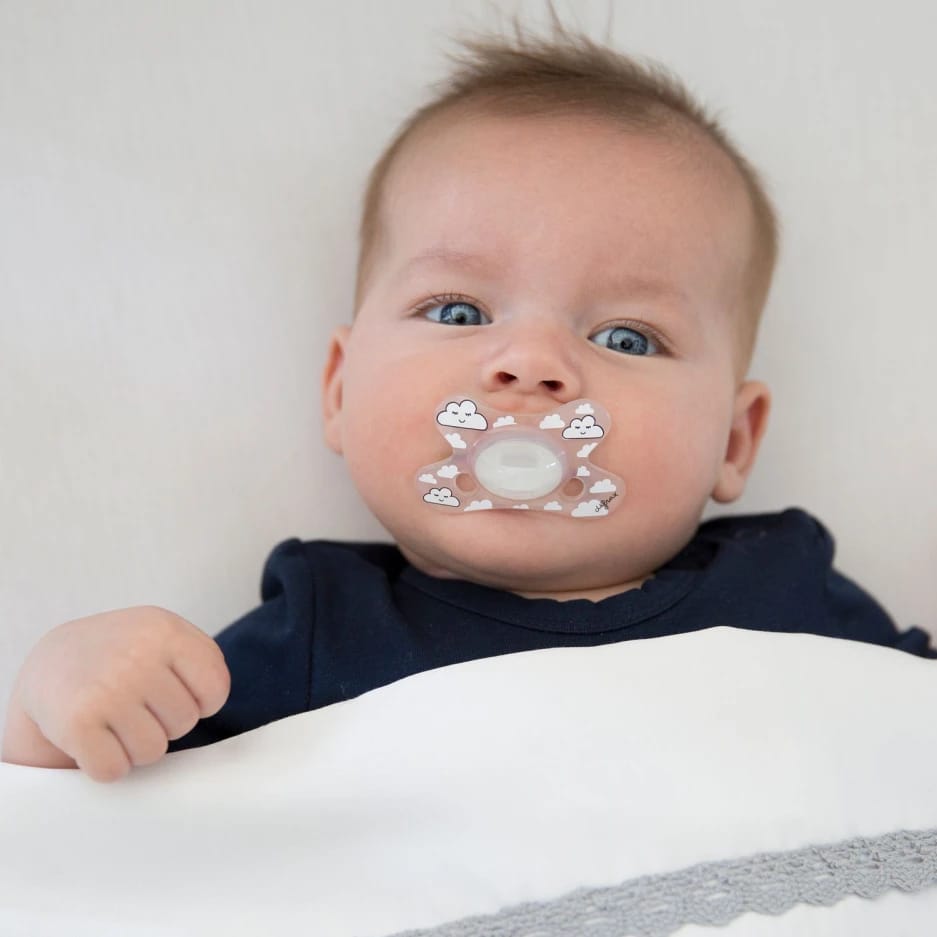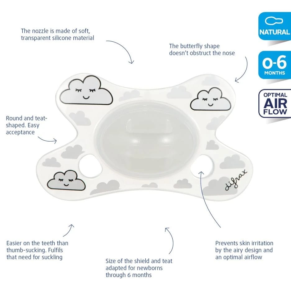 * Þar sem skjöldur snuðanna er fiðrildalagaður, falla þau vel að andliti barnsins og það loftar vel um vitin.
