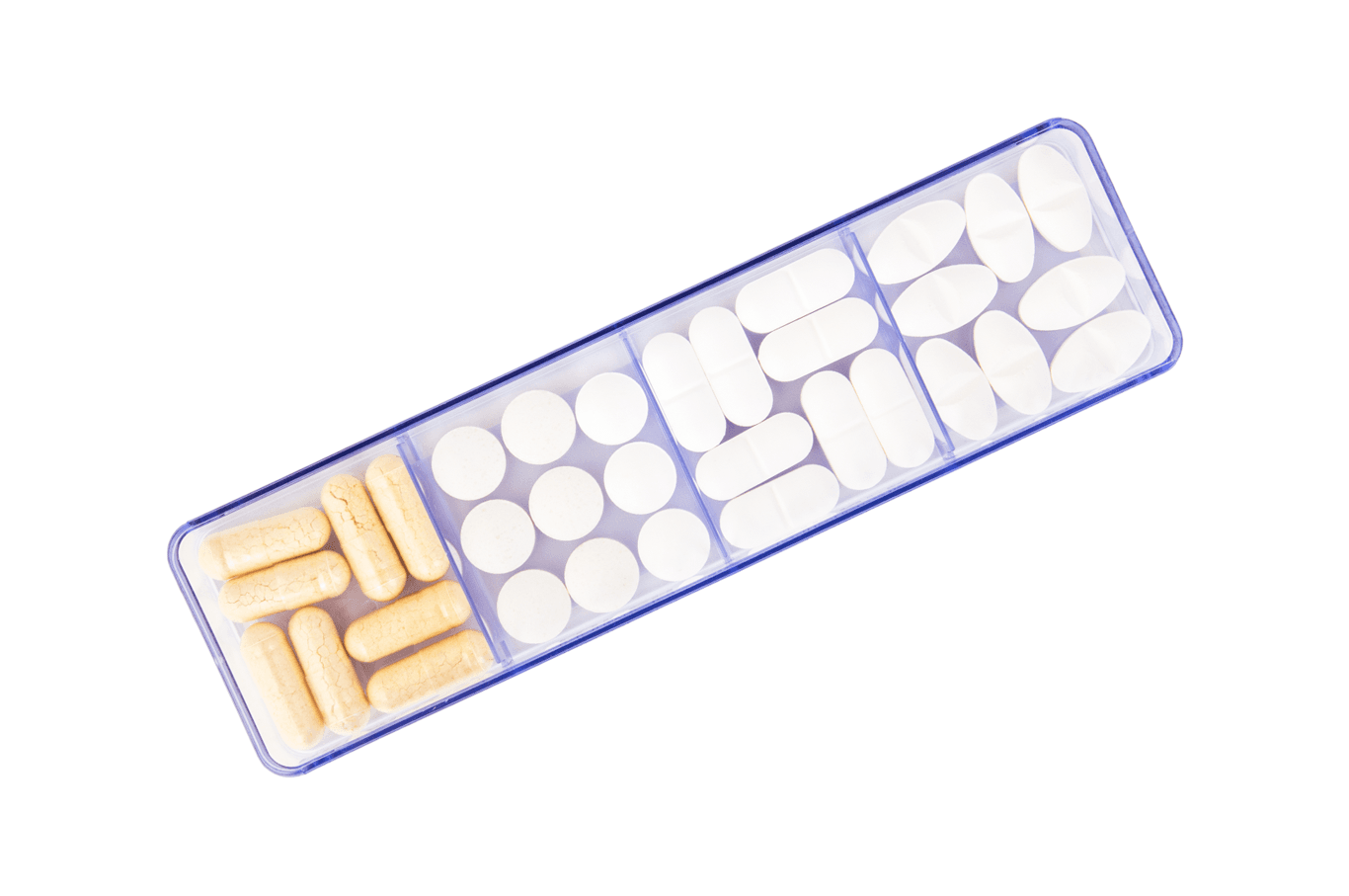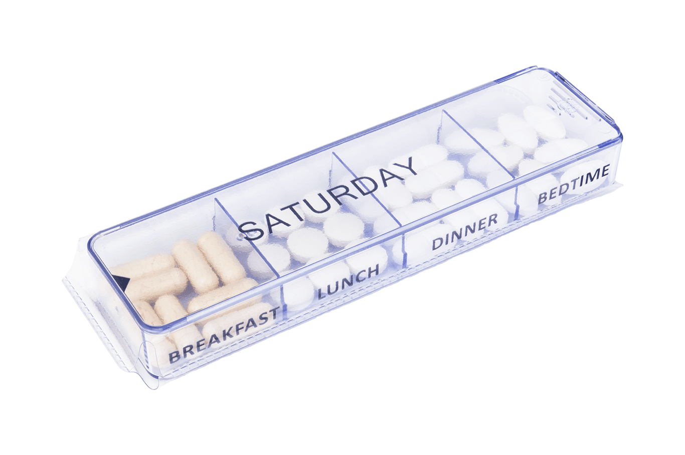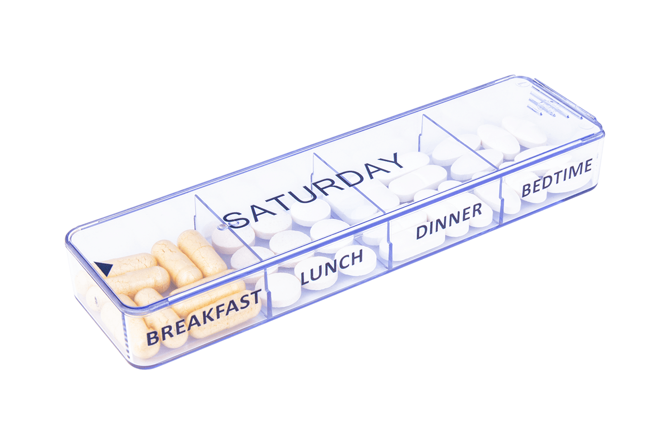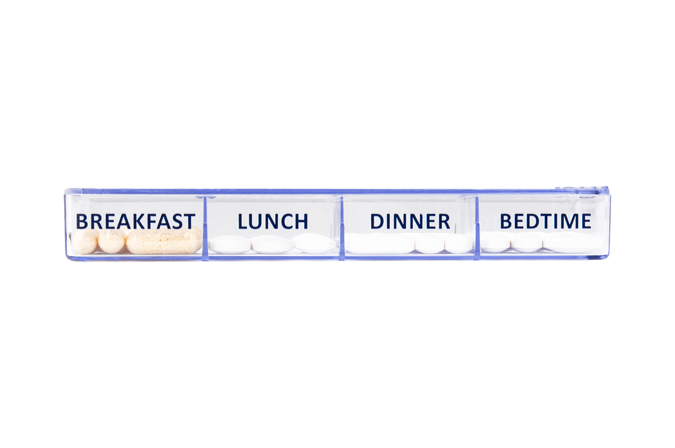 Hver pillubox skiptist í fjögur hólf merkt „Morgunmatur, hádegismatur, kvöldverður og háttatími“.