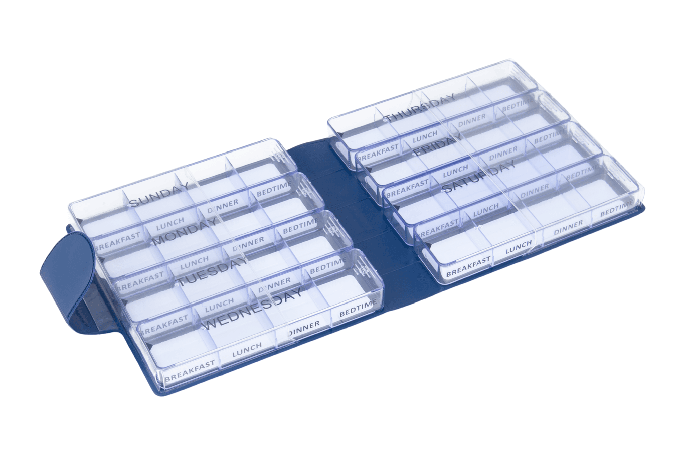 Pilluboxin eru geymd í sterku vínylhlíf með frönskum rennilás. Ermi í einu stykki fylgir með sem gerir notandanum kleift að bera einstaka kassa. Það inniheldur einnig lyfjakort. Nafn sjúklings og aðrar mikilvægar upplýsingar má merkja neðst á hverri pilluöskju.