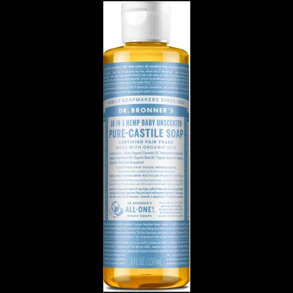 Alhliða sápa, unnin úr lífrænum olíum án allra kemískra efna Hentar börnum, fólki með viðkvæma húð og öllum hinum Eina sápan sem þú þarft fyrir alla fjölskylduna: Í hárið Í andlitið – fjarlægir farða t.d. vel Á allan líkamann Í baðið eða fótabaðið Til raksturs Á gæludýrin Það er meira að segja hægt að tannbursta sig með sápunni, svo hrein er hún! Baby mild eða lavender er best fyrir börn og fólk með exem eða mjög viðkvæma húð Það er ekki bara hægt að þrífa alla fjölskylduna með Dr.Bronner´s heldur allt heimilið líka! Í þvottavélina Í uppþvottinn Á gólf, glugga, veggi, flísar og önnur yfirborð Í Eldhúsþrifin Til að skola ávexti og grænmeti Á baðherbergið Hrein, lífræn sápa sem virkar! Lífræn fljótandi sápa frá Dr.Bronner´s Á kroppinn: þynnið út með vatni og nuddið milli lófanna svo sápan freyði Hárið: c.a. ½ msk Líkaminn: Eftir þörfum Andlitið: 2-3 dropar Í baðið: 2 msk Fótabað: 1-2 tsk Rakstur: Andlit -10dropar, handakrikar-3dropar, fótleggir: ½ tsk Tannburstun: 1dropi á tannburstan (Já hún bragðast eins og sápa) Fyrir hunda og ketti: Fer eftir stærð en 1-2 msk ættu að duga. Blandið með vatni, nuddið vel inn í feldinn og skolið vandlega úr með volgu vatni. Í heimilisþrifin Í þvottavélina: 1-3 msk Má bæta við ½ bolla matarsóda Í Uppþvottinn: þynnið út í skál eða spreybrúsa u.þ.b. 1 hluti sápa: 10 hlutar vatn Alhliða hreinsisprey: ¼ bolli sápa í 1 líter af vatni Skúringar: ½ bolli sápa í 10 lítra af vatni Ávaxta og grænmetisskol: Látið það sem þvo á í skál með köldu vatni, bætið við u.þ.b. ¼ tsk af sápu. Látið liggja smá stund og hrærið í vatninu. Skolið af með hreinu vatni. Þetta er engan veginn tæmandi listi yfir notkunarmöguleika þessarar frábæru sápu. Prófið ykkur bara áfram og kynnist því sjálf hversu frábær hún er.