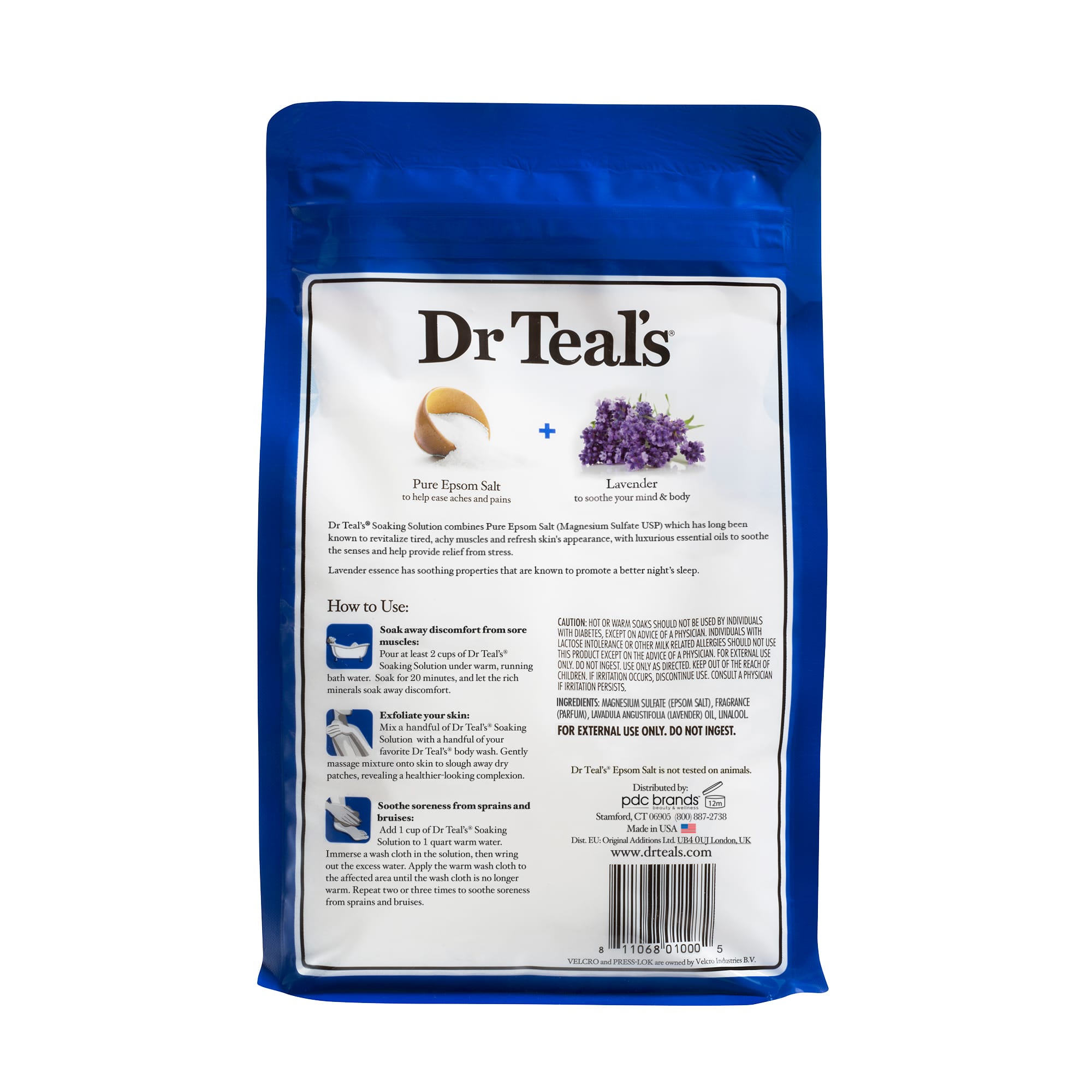 Dr. Teal’s Epsom Salt Soaking Solution sameinar hreint Epsom salt (magnesíum súlfat) og dásamlegar ilmkjarnaolíur. Epsom saltið hefur fyrir löngu sannað eiginleika sína til að draga úr þreytu og verkjum í vöðvum og fríska upp á húðina. Ilmkjarnaolíurnar róa skilningarvitin og draga úr stress tilfinningum. Róandi lavender ilmurinn slakar á huganum og stuðlar að betri svefni á meðan Epsom saltið losar líkamann við verki og þreytu.