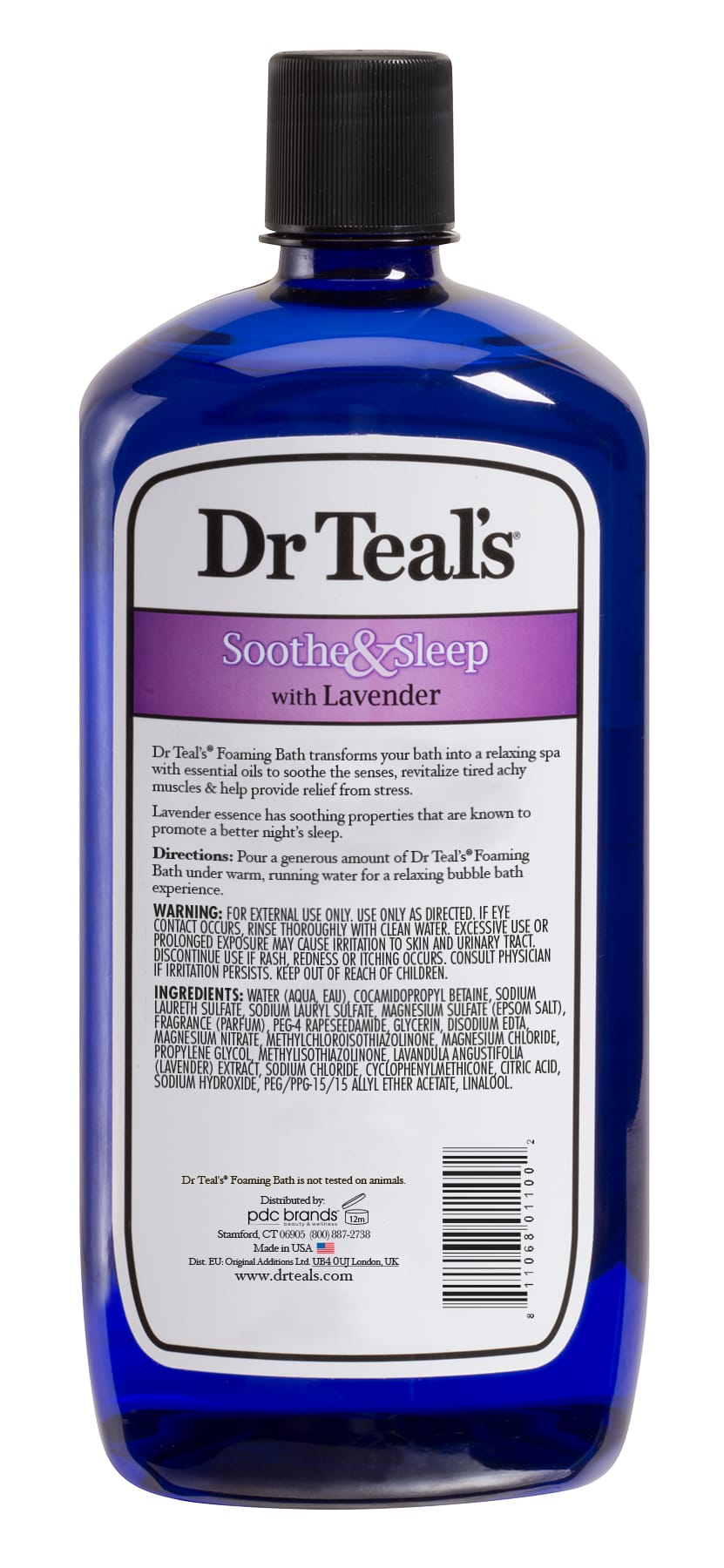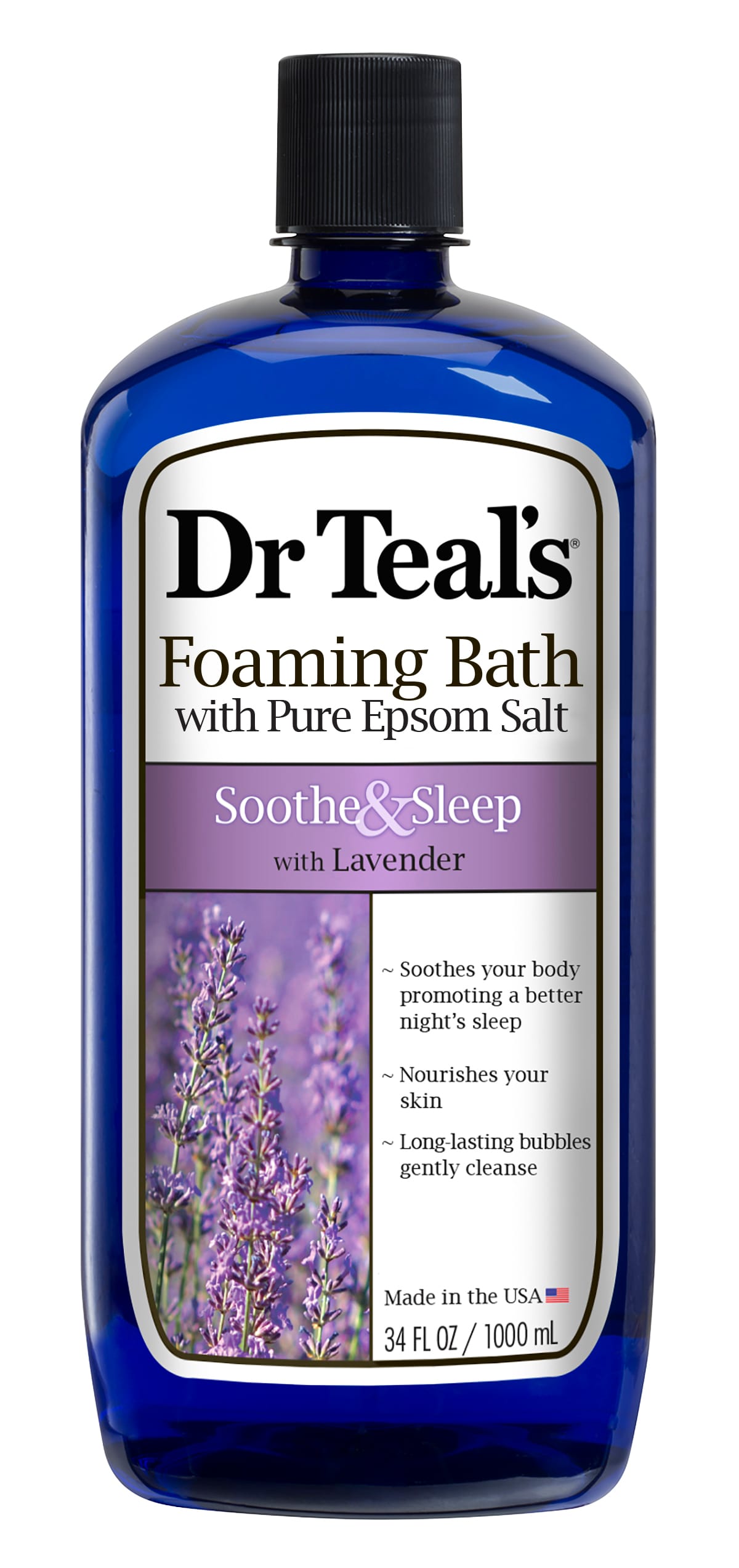 Dr. Teal’s freyðiböðin breyta venjulegu baði í slökunar spa, með því að sameina hreint Epsom salt og dásamlegar ilmkjarnaolíur. Róandi lavender ilmurinn slakar á huganum og stuðlar að betri svefn.