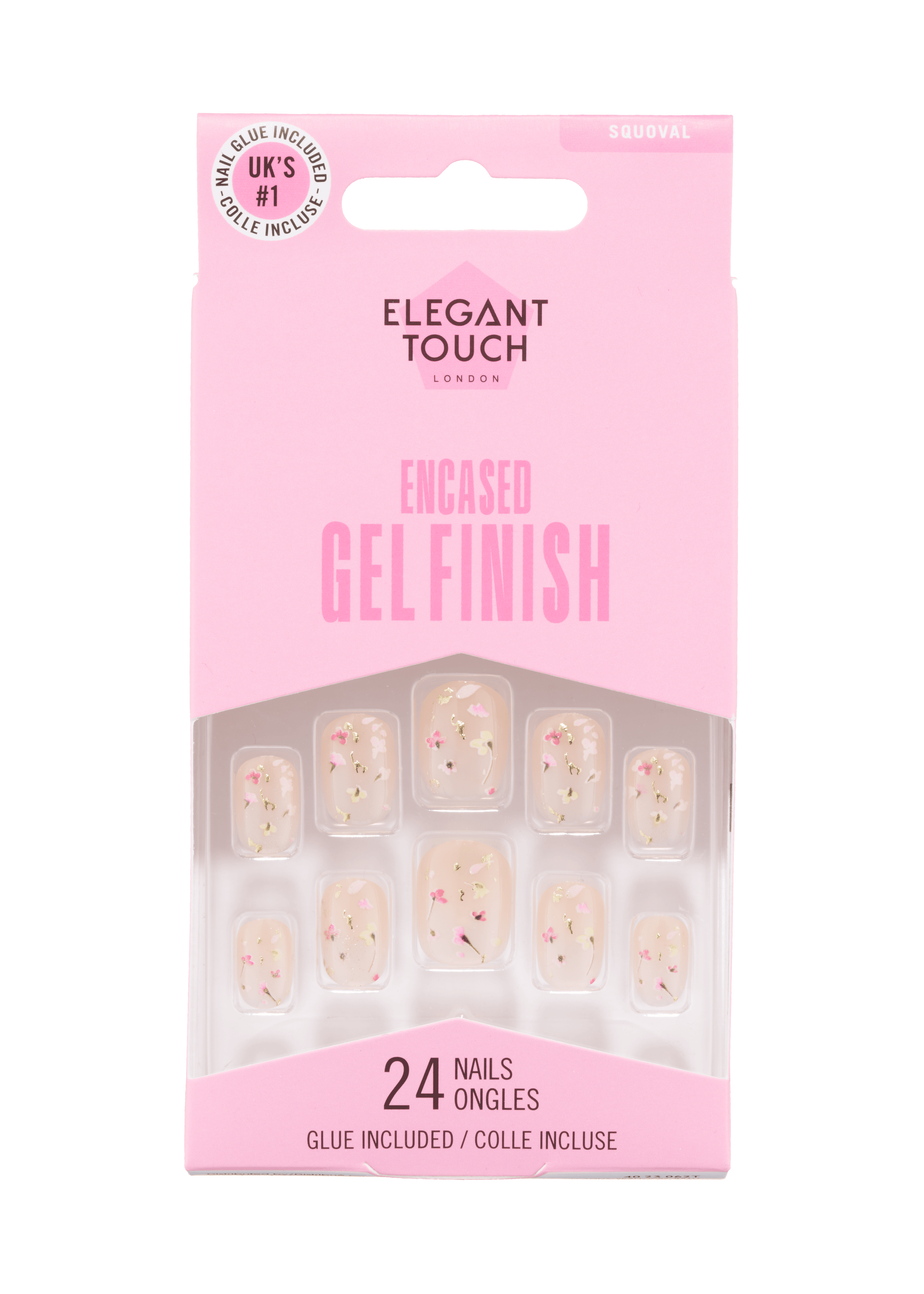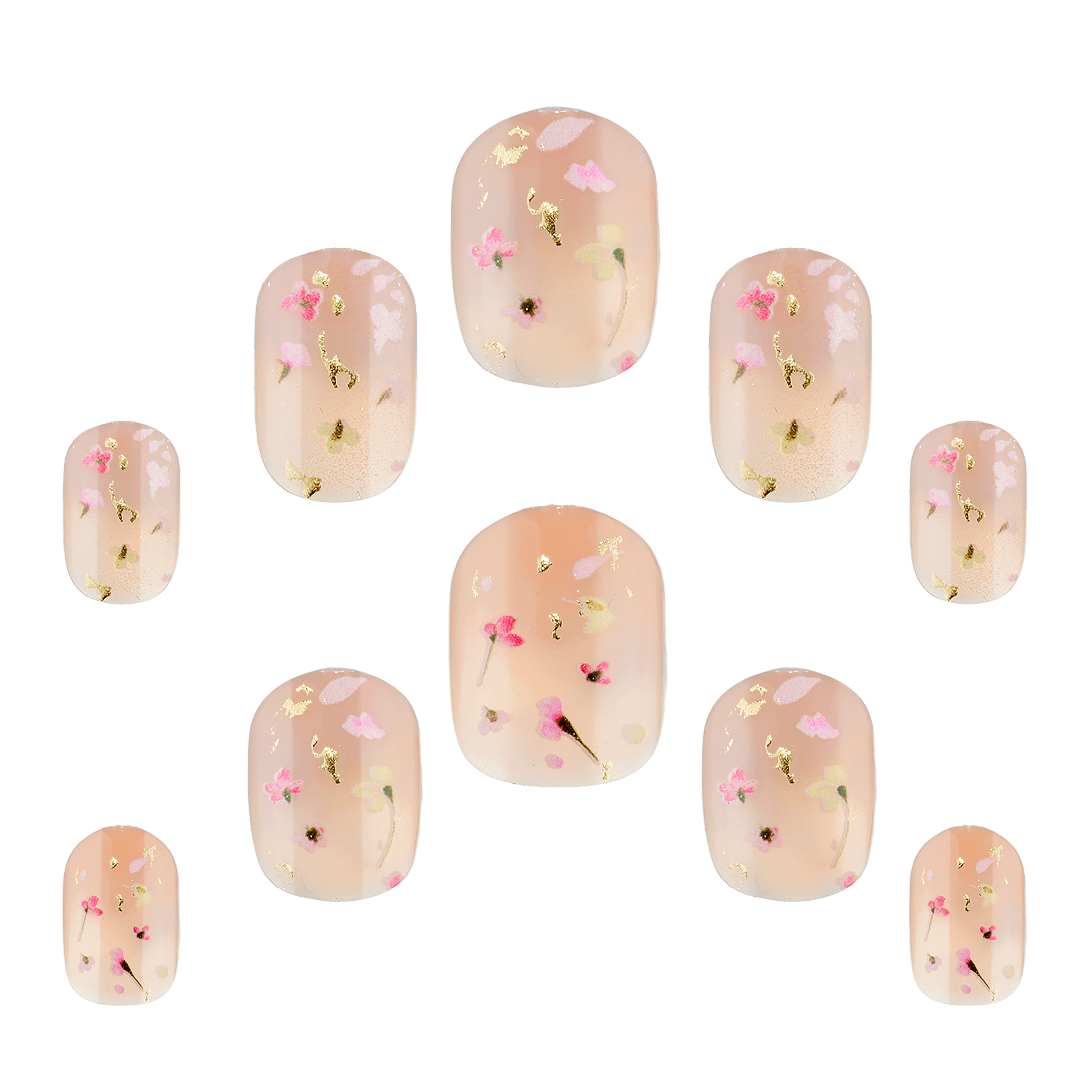 Squoval-neglur með fallegu blómamynstri sem eru hjúpaðar inn í tært og þykkt, gljáandi gel yfirlakk.