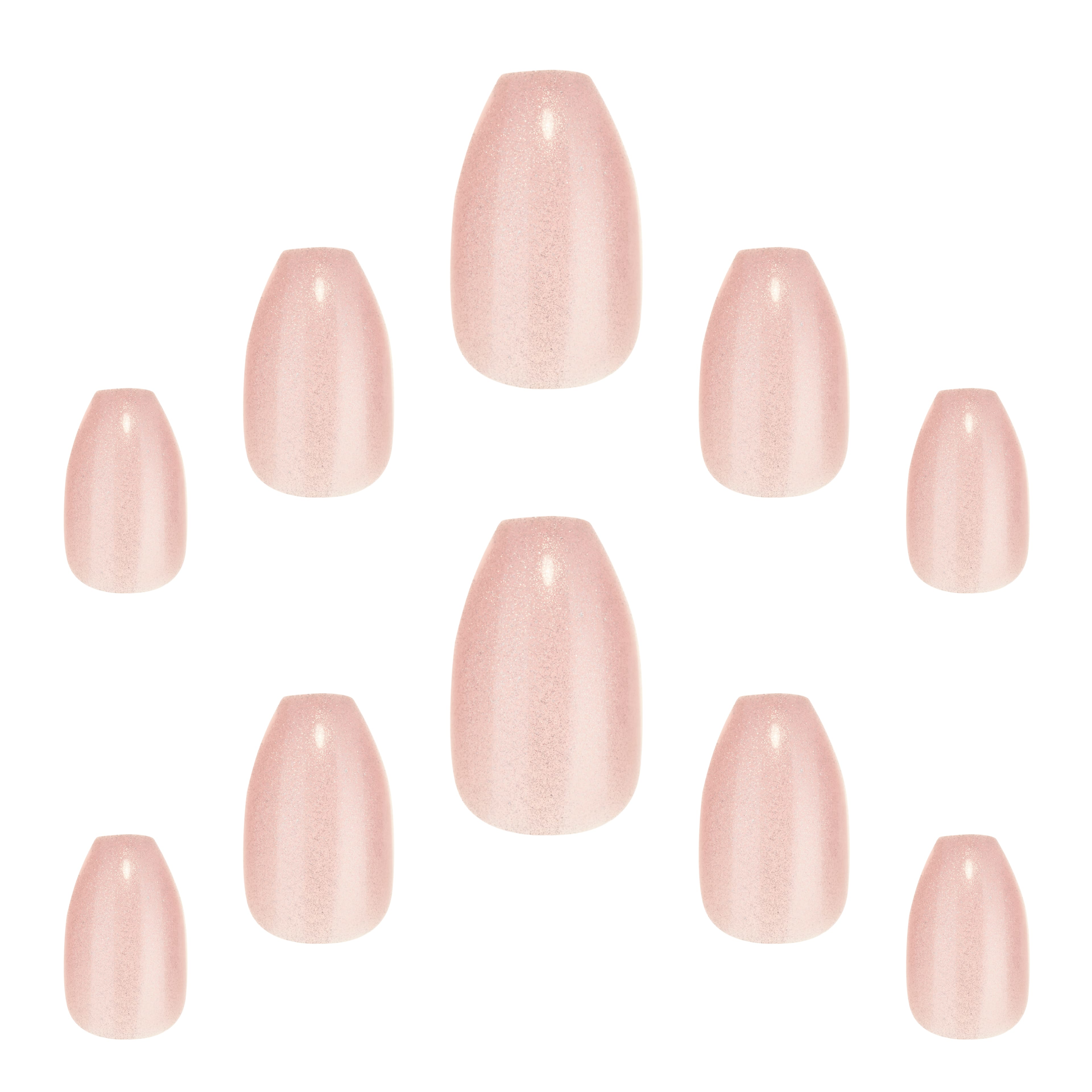 Glitter Celestial frá Elegant Touch eru töfrandi fallegar neglur með bleiku glimmeri. Neglurnar eru með coffin lögun, þar sem neglurnar eru aðeins mjórri að framan en með flatri hlið.