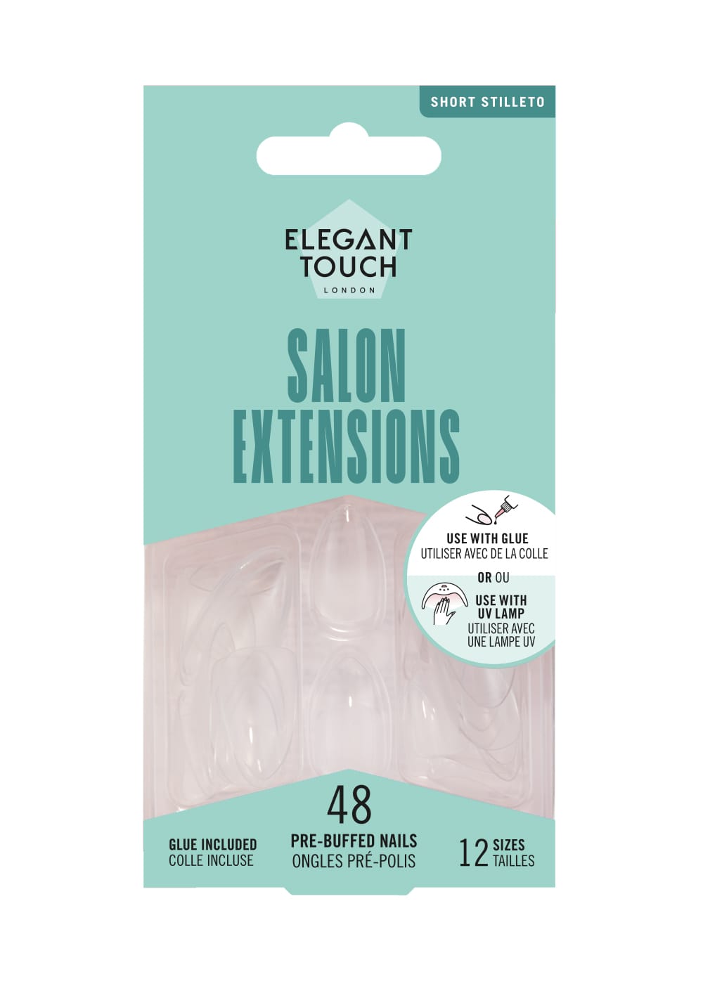Elegant Touch er stærsta gervinagla vörumerki Bretlands og gervineglurnar eru í hæsta gæðaflokki. Neglurnar eru þunnar svo þær virka ekki gervilegar og laga sig að náttúrulegu nöglinni. Neglurnar koma í mismunandi lagi og litum svo hver og einn ætti að geta fundið sínar fullkomnu neglur. Salon Extensions neglurnar koma í miðlungslengd í short stiletto lagi með glansandi áferð. Neglurnar eru glærar að lit og henta fullkomlega til að naglalakka eða skreyta að eigin vild.