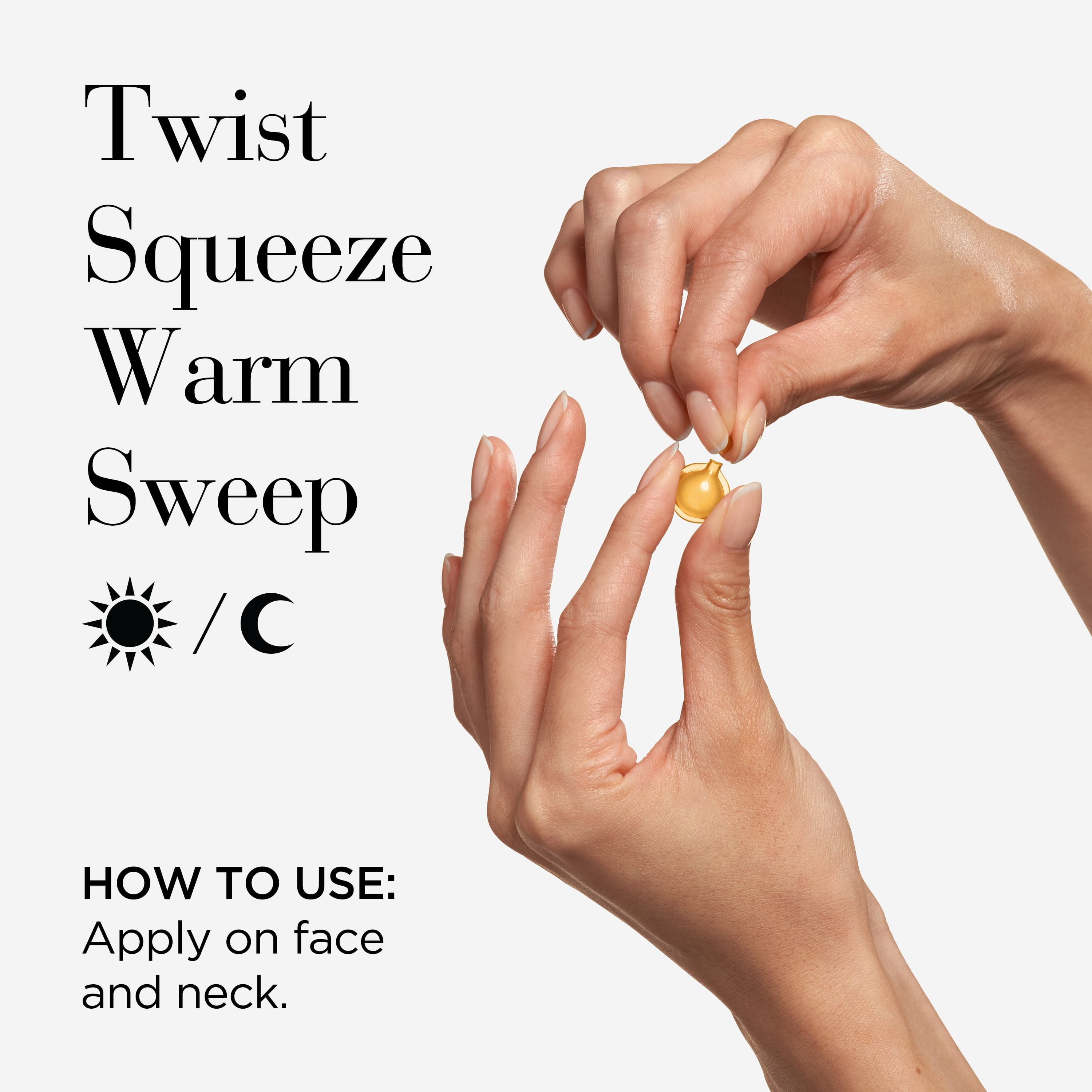 Notið eitt hylki á hreina húð. Má nota kvölds og/eða morgna. Notið svo dag/næturkrem. Hylkið er opnað með því að snúa uppá stútinn.