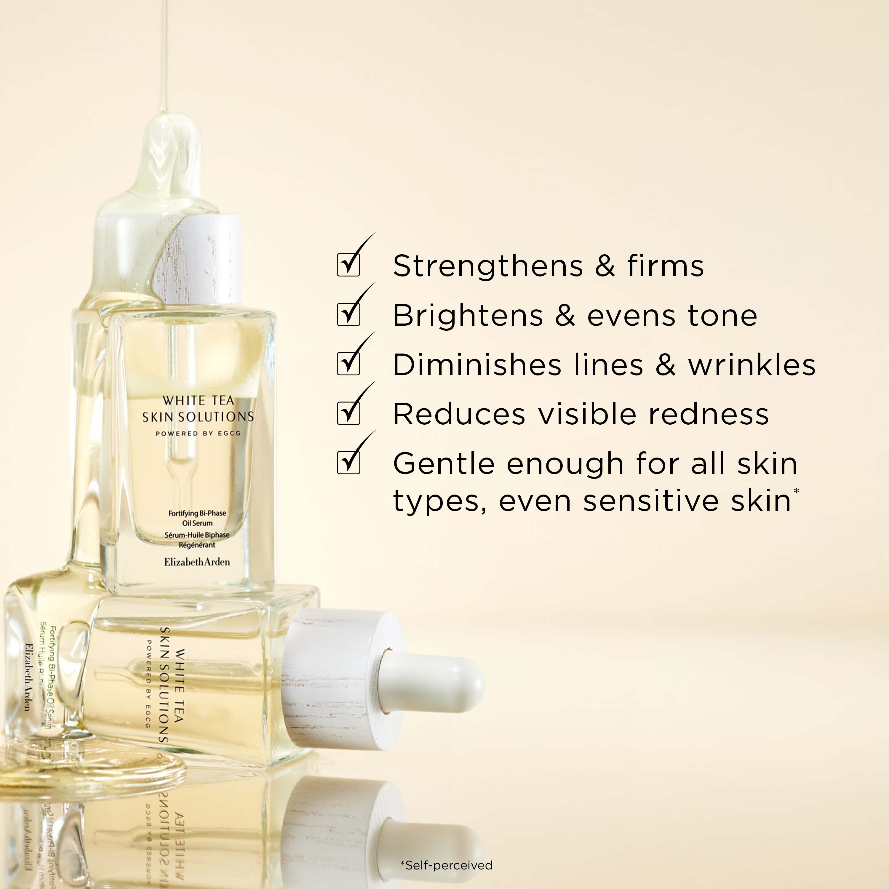 White Tea Skin Solution Serum er létt formúla, knúið af EGCG* Eftir fyrstu notkun er tærleiki húðarinnar endurheimtur** og á aðeins 14 dögum eru 91% sammála um að húðin er stinnari***. Hentar vel fyrir allar húðgerðir jafnvel viðkvæma húð. Vegan *EGCG.er eitt af sterkustu andoxunarefni sem finnst í náttúrunni og virkasta andoxunarefnið sem finnst í laufi White Tea blómsins. **Byggt á prófunum á 34 asískum konum á aldrinum 35-60 ára, eftir fyrstu notkun þar með talið þeim sem eru með viðkvæma húð *** Byggt á neytendarannsókn á 60 asískum konum, á aldrinum 25-55 ára, eftir 2 vikur, þar á meðal þær sem eru með viðkvæma húð