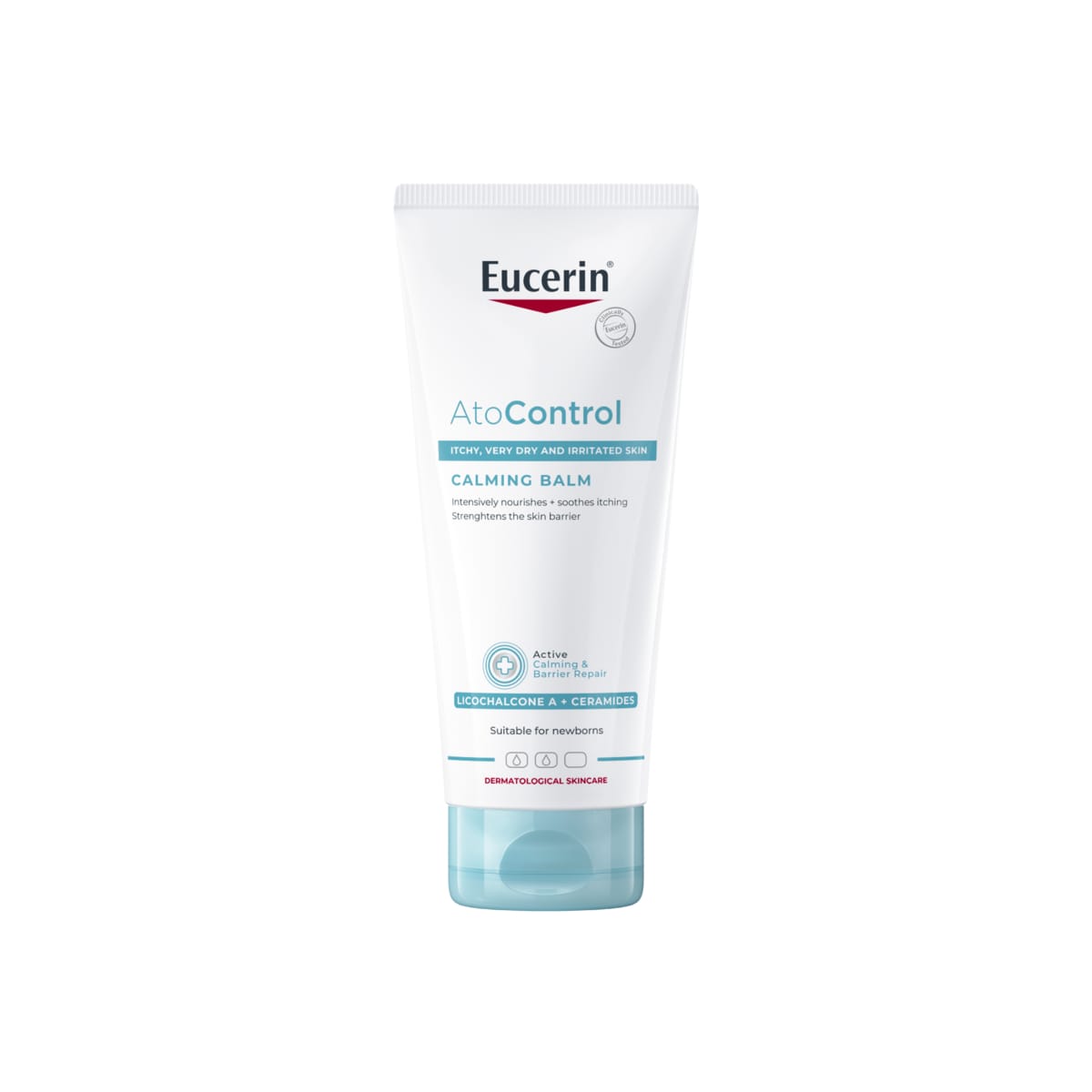 Ofnæmishúð er pirruð, þurr og með kláða. Þessi kláði veldur klóri sem kemur í veg fyrir góðan nætursvefn og getur haft neikvæð áhrif á lífsgæði. Eucerin AtoControl Calming Balm er líkamssmyrsl til daglegrar notkunar sem hefur verið sérstaklega hannað til að róa og gefa pirraðri húð og húð með kláða raka. Þetta létta en nærandi olíu-í-vatn smyrsl er auðgað með róandi Licochalcone A, keramíðum og sjávar smjöri til að styrkja vörn húðarinnar og draga úr þurrki og kláða. Ofnæmis eksem smyrslið veitir tafarlausan raka til að gera húðina mjúka og slétta og með reglulegri notkun batnar ástand húðarinnar áberandi. Ilmlausa smyrslið hefur létta, skemmtilega áferð sem frásogast fljótt og er ekki feitt og klístrað. Eucerin AtoControl Calming Balm er húðfræðilega prófað fyrir þurra, ofnæmishúð. Það er óhætt að nota frá fyrsta degi fyrir viðkvæma húð nýbura og barna, bleyjusvæði aðeins frá 1. Mánuði Vegna viðkvæmrar en áhrifaríkrar formúlu er það einnig tilvalið fyrir börn og fullorðna, þess vegna smyrsl fyrir alla fjölskylduna sem varðveitir húðhindrunina og róar virkan kláða í húð.