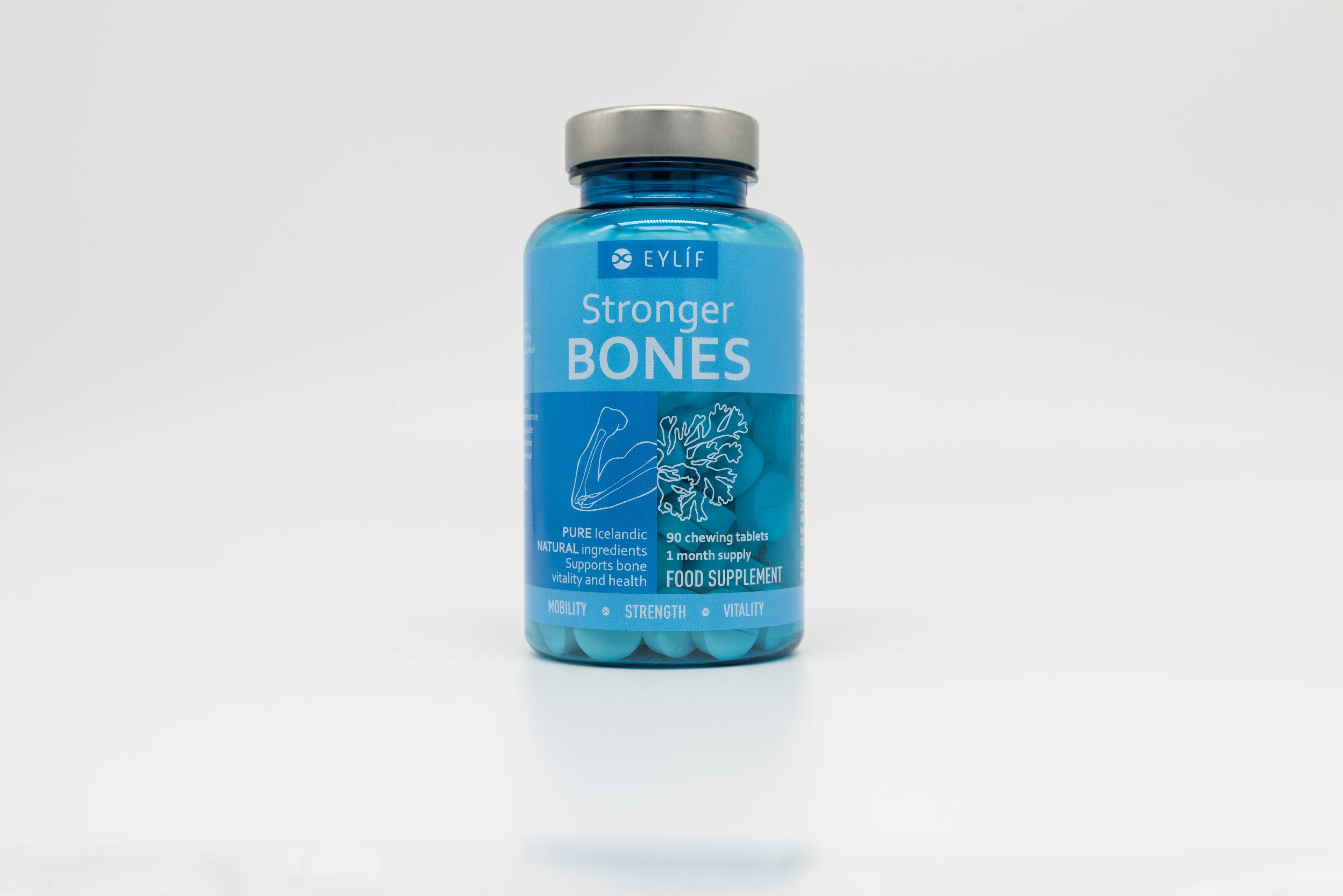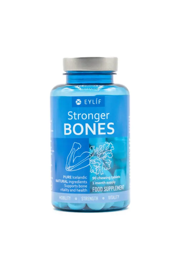 Stronger Bones frá Eylíf inniheldur níutíu tuggutöflur í glasi. Best er að tyggja þrjár á dag með mat til að styrkja bandvef og viðhalda sterkum beinum, alla ævi.