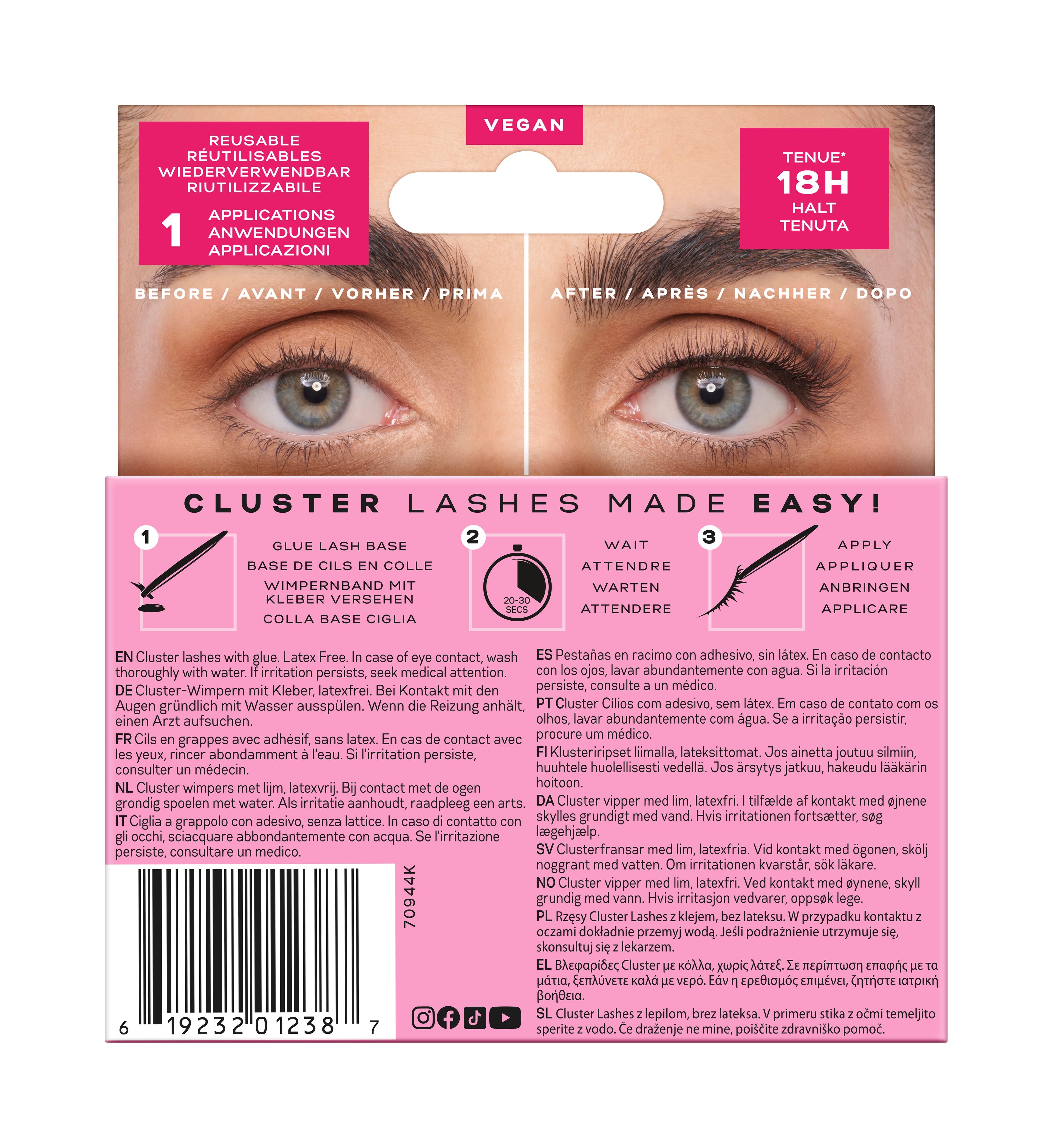 Klasaaugnhár hafa aldrei verið einfaldari! Þú sett er tilbúið til notkunar og gefur fallegt útlit með lengstu klösunum í miðjunni fyrir lyft, doll-eye áhrif. Þau eru fullkomin til að nota bæði ofan á eða undir eigin augnhár, fyrir náttúrulega fyllingu og lengd á örfáum mínútum. Handgerð og endurnýtanleg með latexlausu lími sem heldur þeim öruggum í allt að 18 klst.
