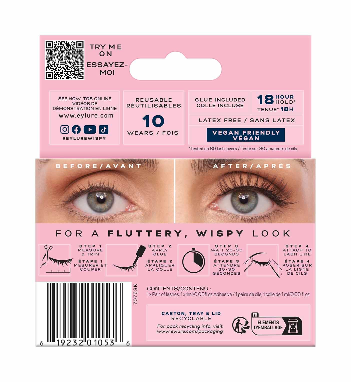 Eylure Light & Wispy No.162 gefur náttúrulegt, létt og fíngert útlit á augabragði. Styttra band – engin þörf á að klippa! Endurnýtanleg allt að 10 sinnum, með latexlausu lími sem heldur í allt að 18 klst