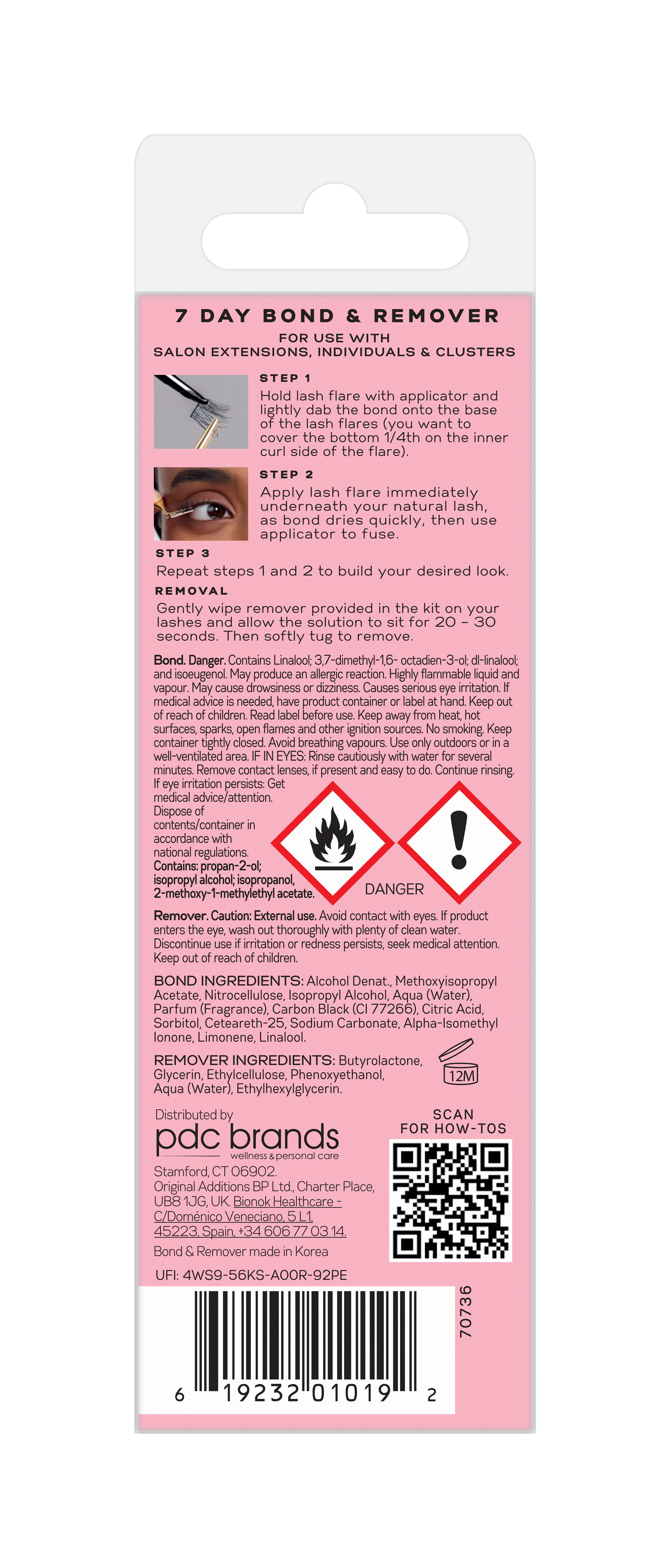 BOND INGREDIENTS: Alcohol Denat., Methoxyisopropyl Acetate, Nitrocellulose, Isopropyl Alcohol, Aqua (Water), Parfum (Fragrance), Carbon Black (CI 77266), Citric Acid, Sorbitol, Ceteareth-25, Sodium Carbonate, Alpha-Isomethyl Ionone, Limonene, Linalool. REMOVER INGREDIENTS: Butyrolactone, Glycerin, Ethylcellulose, Phenoxyethanol, Aqua (Water), Ethylhexylglycerin.