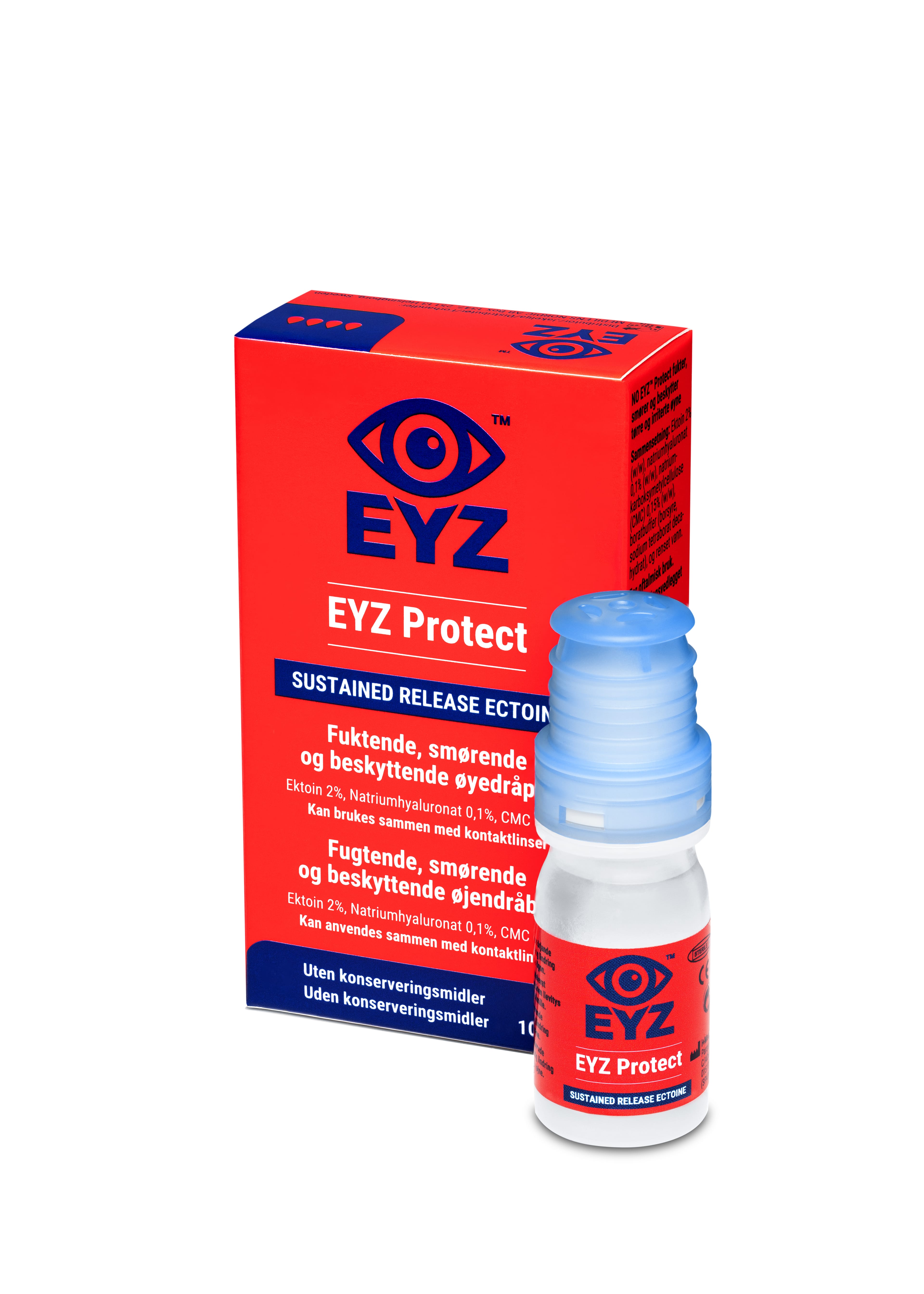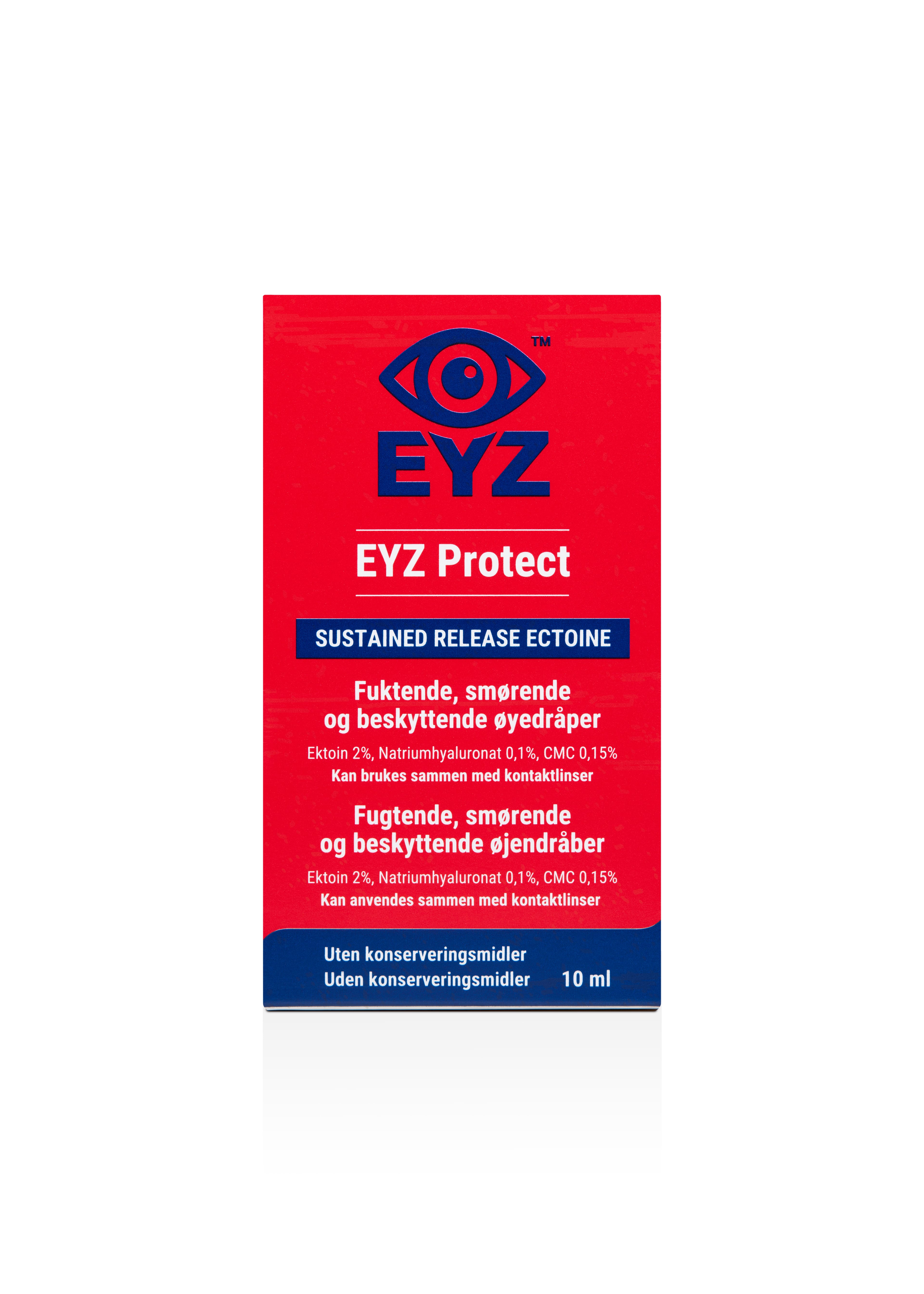 EYZ Protect eru smyrjandi augndropar með einstakri þrívirkri formúlu sem sameinar Ectoin, hýalúrónsýru og CMC (karboxýmetýlsellulósa) til að ná sem bestum árangri. Ectoin (2%): Náttúrulegt efni sem verndar, kemur á stöðugleika tárafilmunnar og dregur úr ofnæmiseinkennum. Hefur rakagefandi og þrota minnkandi eiginleika. Hýalúrónsýra (0.1%): Veitir langvarandi raka og verndar yfirborð augans með því að styðja við tárafilmuna. CMC (0.15%): Binst yfirborði augans, heldur rakanum í auganu og losar Ectoin smátt og smátt. Mildir fyrir viðkvæm augu og tilvalin til tíðrar notkunar.. Má nota með augnlinsum. Án skaðlegra rotvarnarefna og fosfata