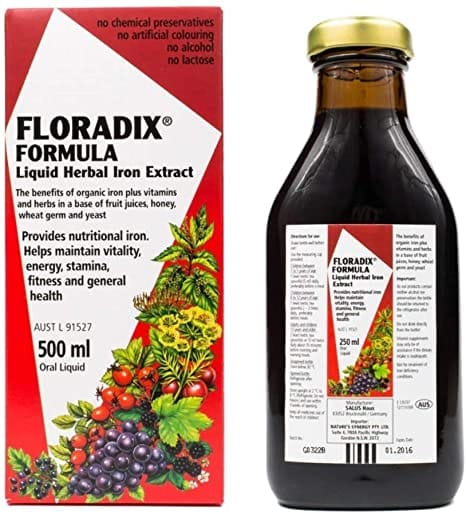 Floradix er bragðgott jurtajárn sem fer vel í magann. Járn- og blóðaukandi mixtúra unnin úr jurtum, ávöxtum, næringargeri, þara og hveitikími. Hentar á meðgöngu og má gefa börnum með járnskort frá þriggja ára aldri. Án laktósa, alkóhóls og mjólkur. Vegan