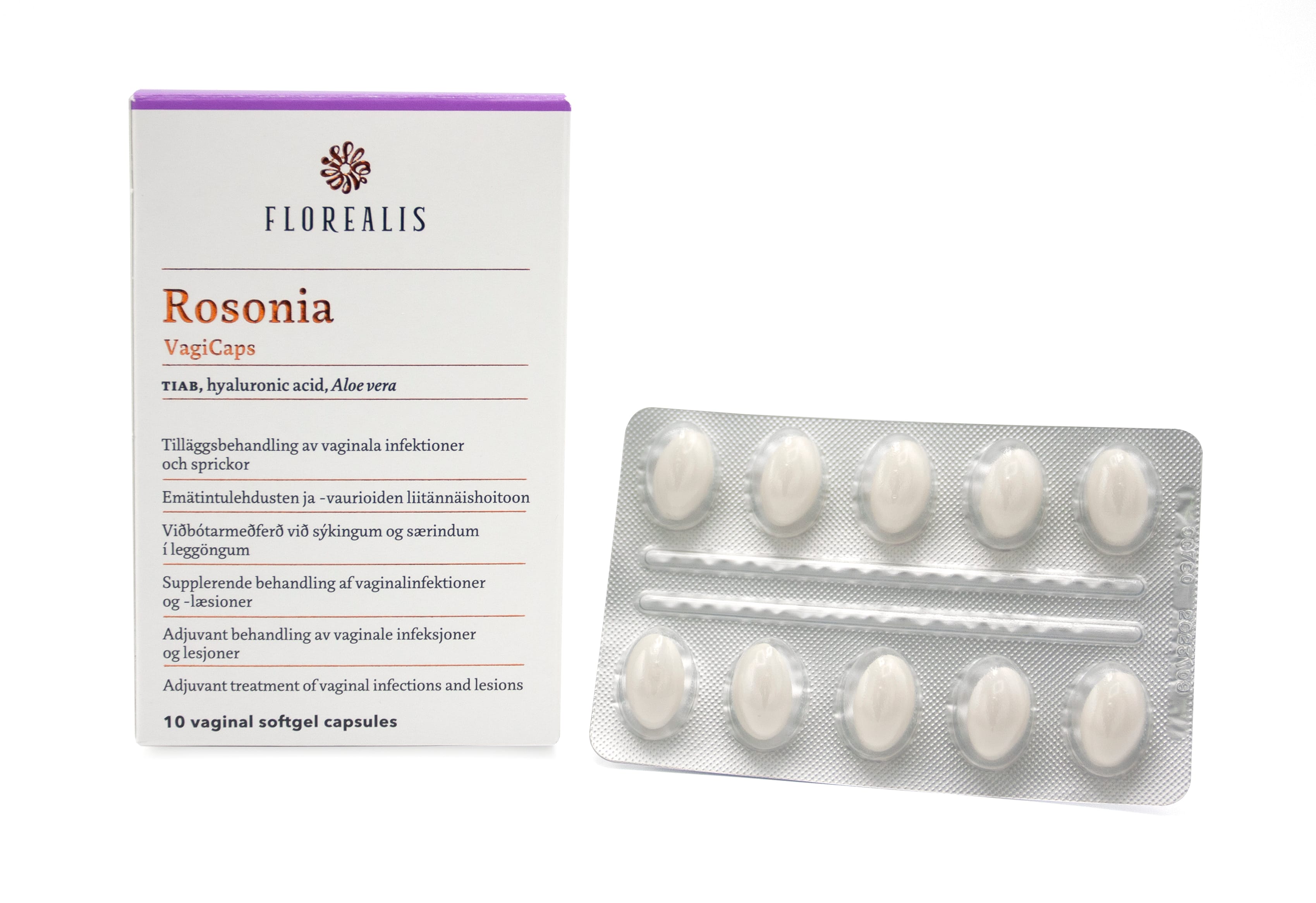 Rosonia VagiCaps er fljótvirk, staðbundin meðferð við óþægindum í leggöngum s.s. sviða, kláða, særindum og óeðlilegri útferð. Myndar varnarhimnu sem vinnur gegn bakteríu-, sveppa- og veirusýkingum. Stuðlar að náttúrulegri flóru í leggöngum. Græðandi við særindum eftir fæðingu. Mjúk lítil hylki í leggöng, eitt hylki fyrir svefn í eina viku eða eftir þörfum.