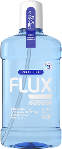 Flux Fresh Mint munnskol gefur góðan andardrátt vegna samsetningar á sinklaktati og litlum skammti af klórheídíni sem hlutleysir efni sem valda vondri lykt. Flux Fresh Mint styrkir einnig yfirborð tannanna og kemur í veg fyrir tannskemmdir. Munnskolið er án alkóhóls og literefna.