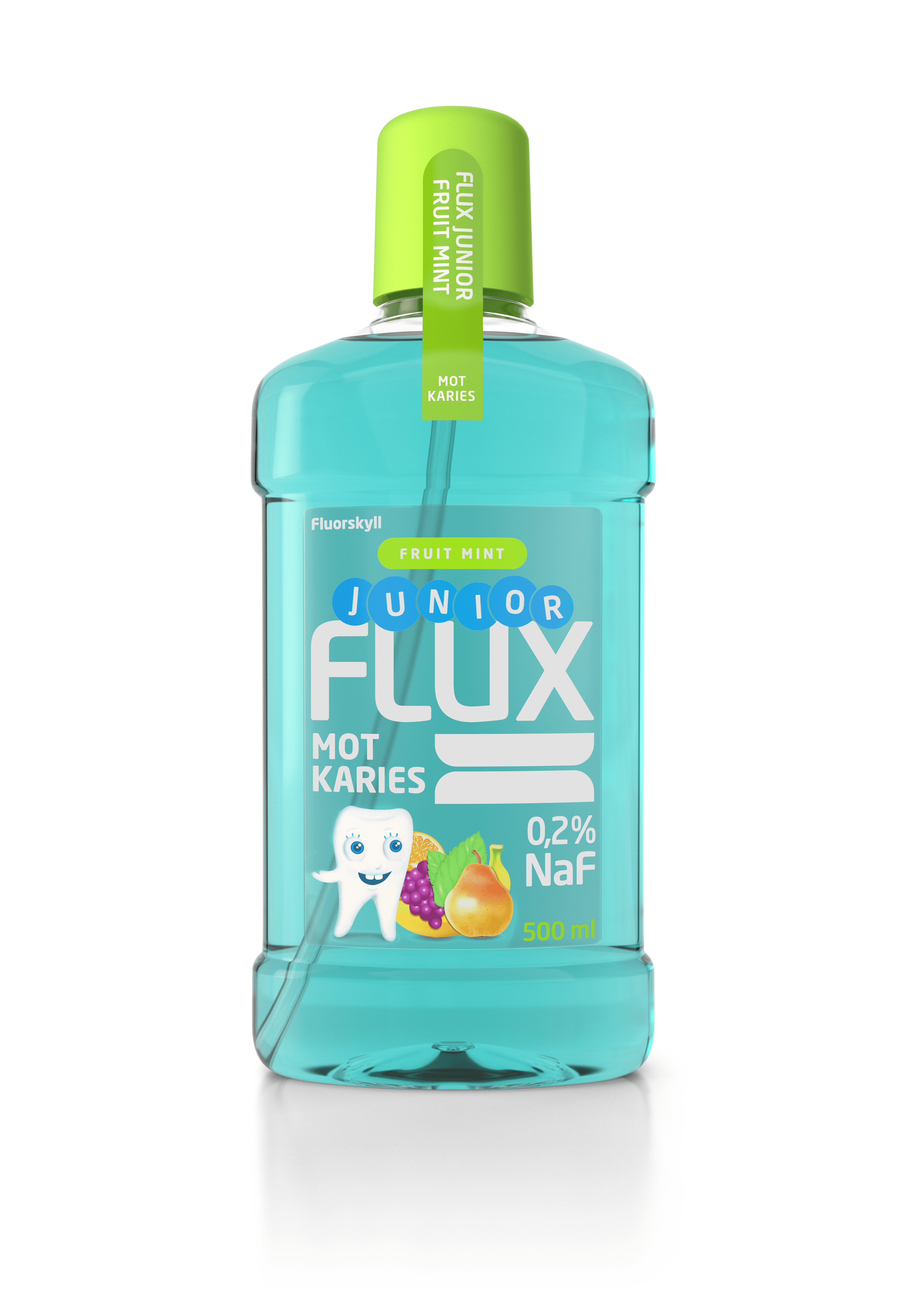 flúarlausn sem styrkir yfirborð tannanna. Regluleg notkun Flux kemur í veg fyrir tannskemmdir. Mælt er með að nota munnskolið 1-2svar á dag sem viðbót við tannburstun með flúortannkremi. Flux Junior munnskolið er án alkóhóls og litarefna. Varan ber meðmælatákn frá sænska tannlæknafélaginu, Flux hefur verið þróað í Svíþjóð í nánu samstarfi við tannlækna.