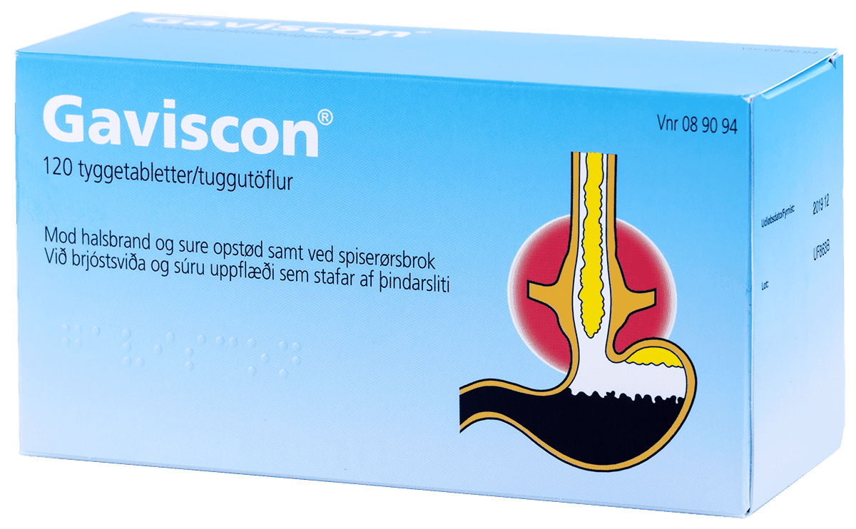 Gaviscon tuggutöflurnar er notaðar við brjóstsviða og súrum uppköstum. Byrjar að virka innan 2 mínútna og varir í yfir 2 klst.