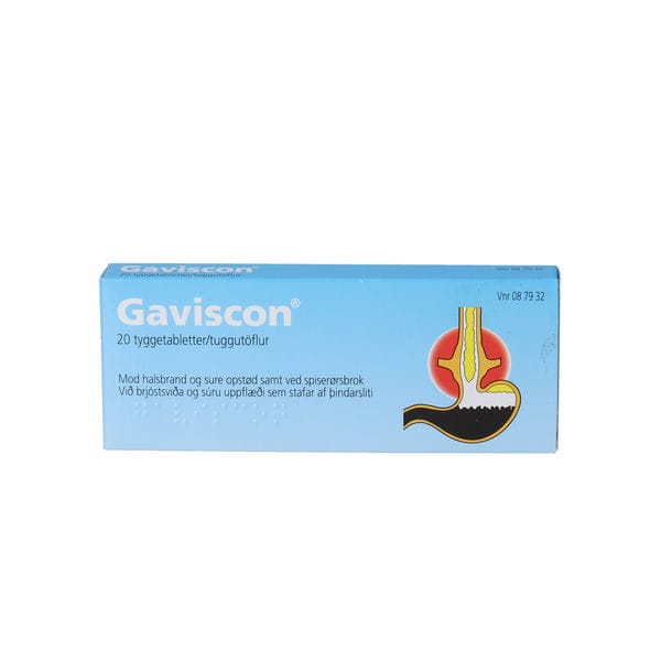 Gaviscon tuggutöflurnar er notaðar við brjóstsviða og súrum uppköstum. Byrjar að virka innan 2 mínútna og varir í yfir 2 klst