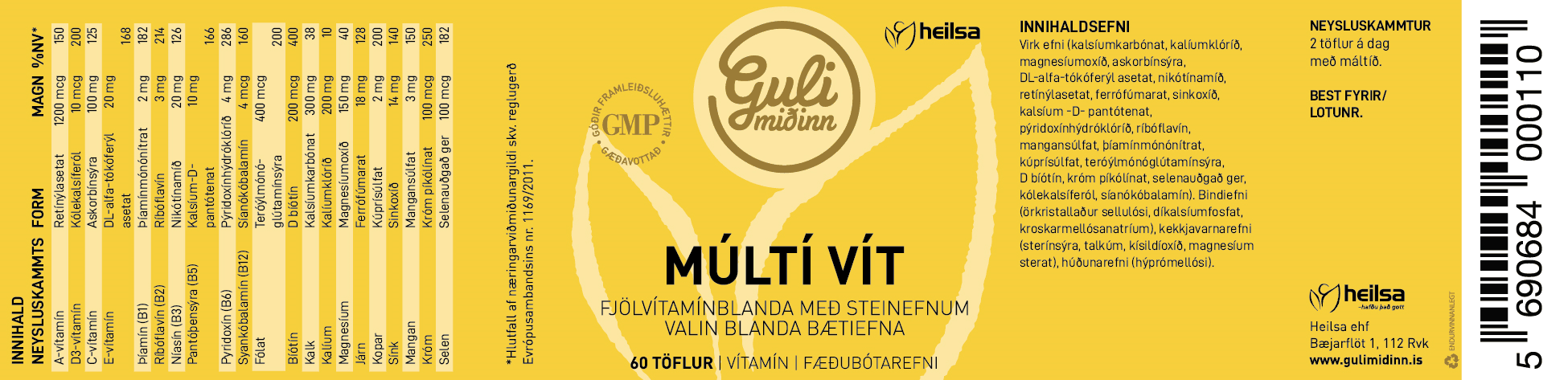 2 töflur á dag. Múltí vít er ekki ráðlagt barnshafandi konum. Ekki skal neyta meira en ráðlagður dagskammtur segir til um. Vítamín og bætiefni eru ekki ætluð til þess að lækna sjúkdóma eða að koma í veg fyrir þá og eiga ekki að koma í stað fjölbreyttrar og hollrar fæðu. Geymist þar sem börn hvorki sjá né ná til. Ábyrgðaraðili: Heilsa