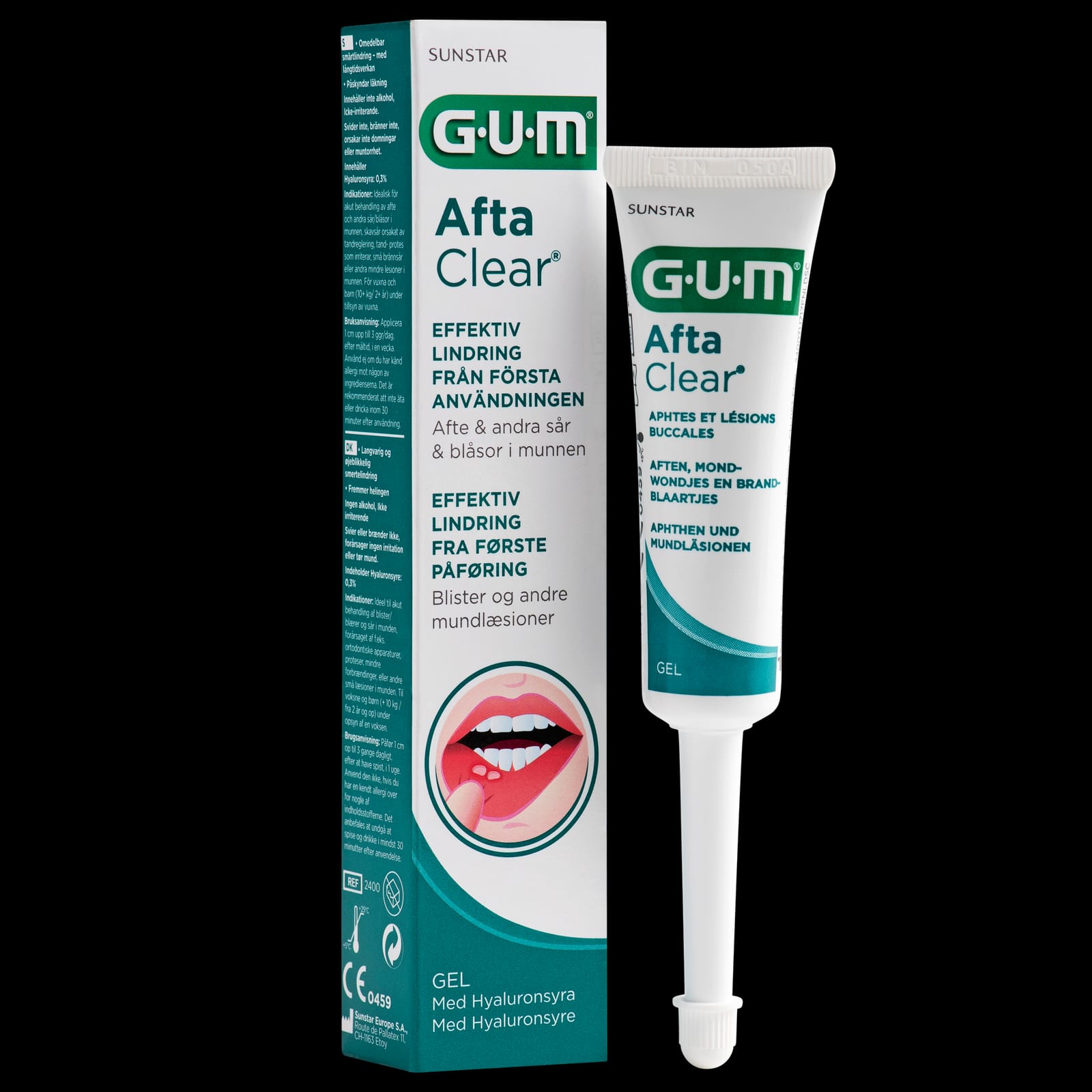 Þerrið svæðið sem bera þarf á. Berið svo GUM AftaClear gelið á sárið/blöðruna og bíðið í um 30 sekúndur. Berið á svæðið 2-3 sinnum á dag þar til einkenni hverfa.