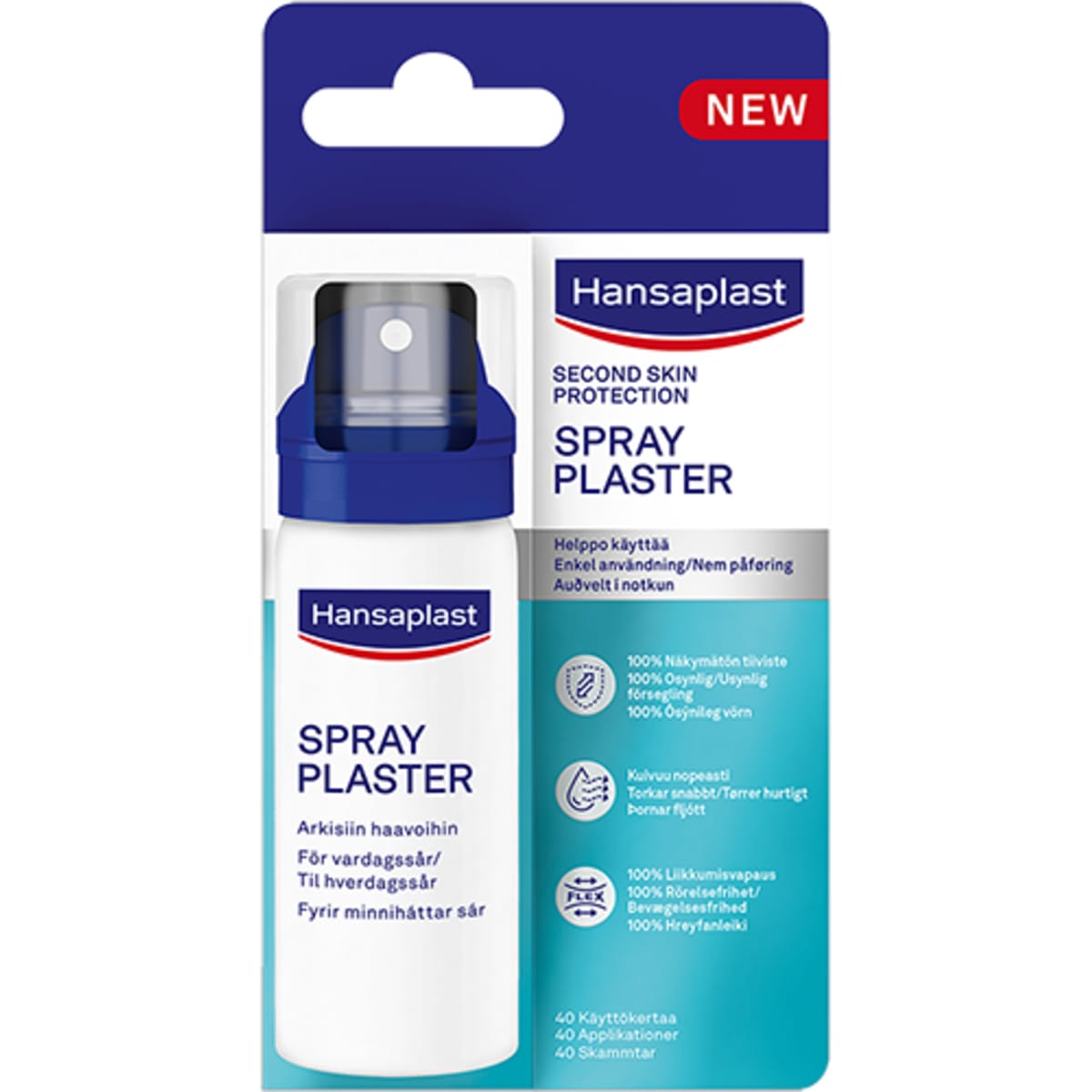Við úðun þornar spey plásturinn hratt og myndar ósýnilega, sveigjanlega og ofurþunna filmu sem ver sárið fyrir óhreinindum og vatni. Auðvelt í notkun.