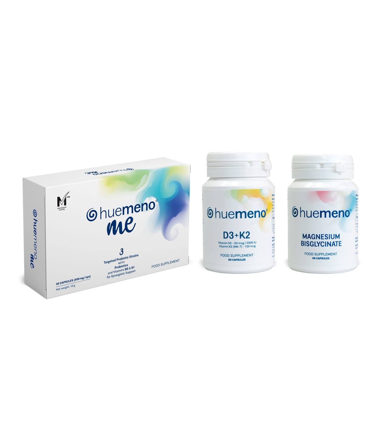 huemeno® Me er aðalvaran í línunni og styður við grunnþætti heilsunnar. huemeno® Me er fyrsta val fyrir heildræn áhrif á meltingu, þarmaflóru, efnaskipti og flóru legganganna auk þess að stuðla að reglu á hormónastarfsemi, eðlilegri starfsemi taugakerfisins og stuðla að minni þreytu og lúa.
