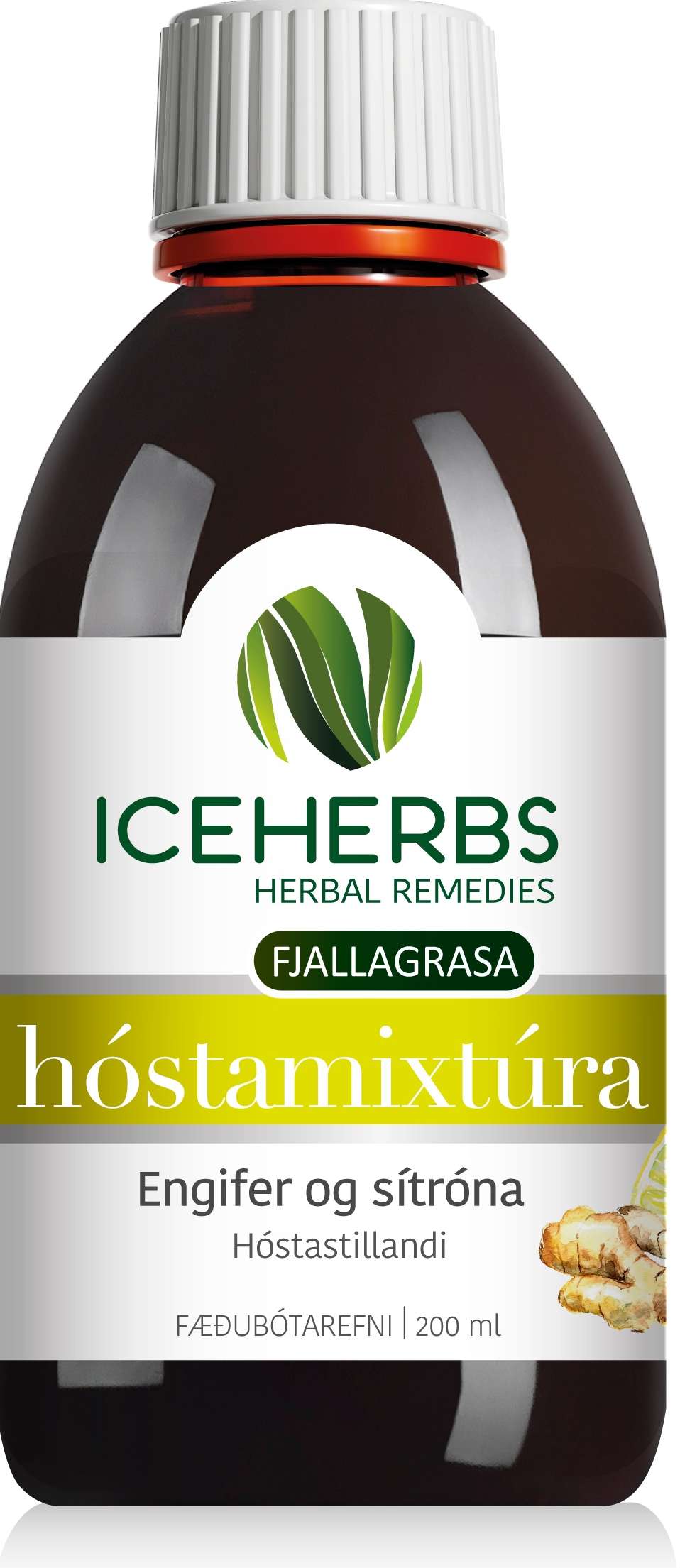 Fjallagrasa hóstamixtúran með engifer og sítrónu vinnur gegn særindum í hálsi.