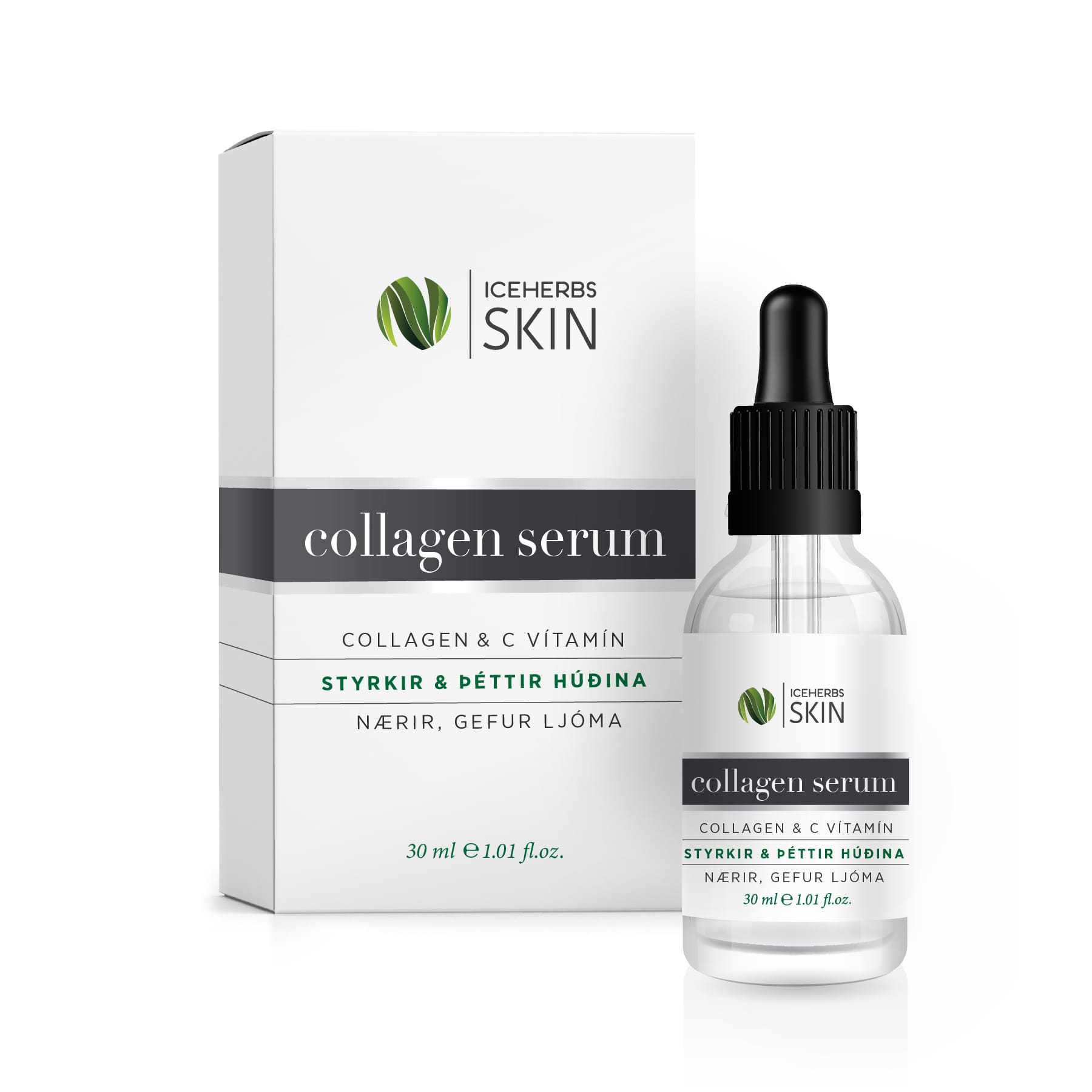 97% náttúruleg innihaldsefni. Virkt andlitsserum sem vinnur gegn hrukkumyndun. Inniheldur styrkjandi collagen, c-vítamín og lífrænt Aloe Vera. Collagen er mikilvægt prótein og uppbyggingarefni fyrir húðina. Það hjálpar til við að auka stinnleika og birtu húðarinnar, ásamt því að minnka sýnileika öldrunareinkenna. - Sléttir úr hrukkum og kemur í veg fyrir myndun þeirra. - Þéttir húð. - Vinnur gegn tapi á stinnleika og teygjanleika. Þessi vara er án allra ilmefna og hentar vel fyrir viðkvæma húð. Allar ICEHERBS SKIN vörur eru án parabena, sílikona og sterkra súlfata. Við notum mild form efna sem henta húðinni betur – án málamiðlana í virkni.