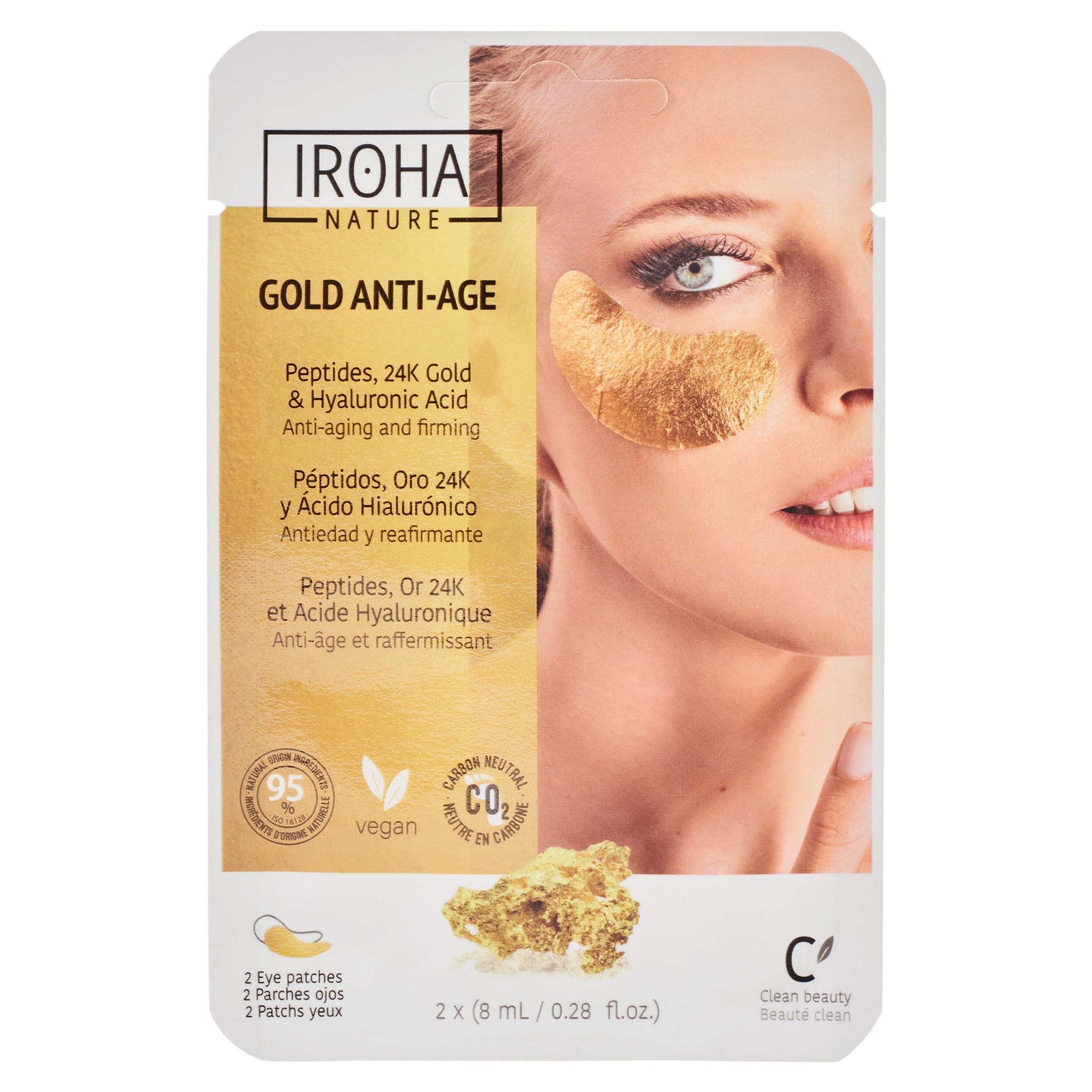 Iroha Nature gull augnmaskarnir gefa raka og stinna húðina í kringum augnsvæðið. Maskarnir eru með tvöfalt lag sem eykur sauna áhrifin þar sem tvöfalda lagið heldur rakanum að húðinni og þar með eykst árangur virku innihaldsefnanna