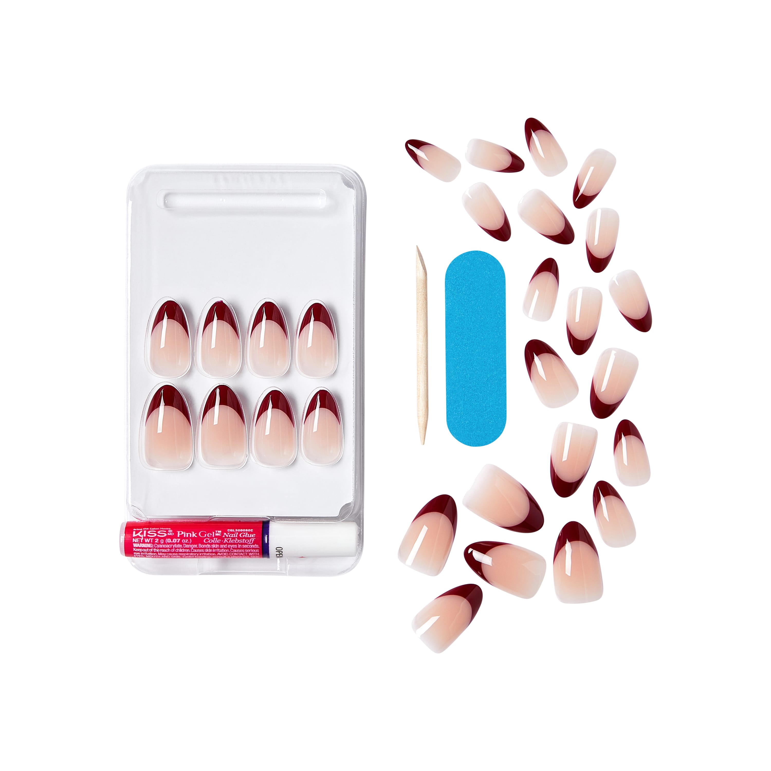 28 miðlungs langar og endingargóðar akrýl gervineglur með vínrauðu french í pakka. Almond lögun. Naglalím og naglaþjöl fylgir.
