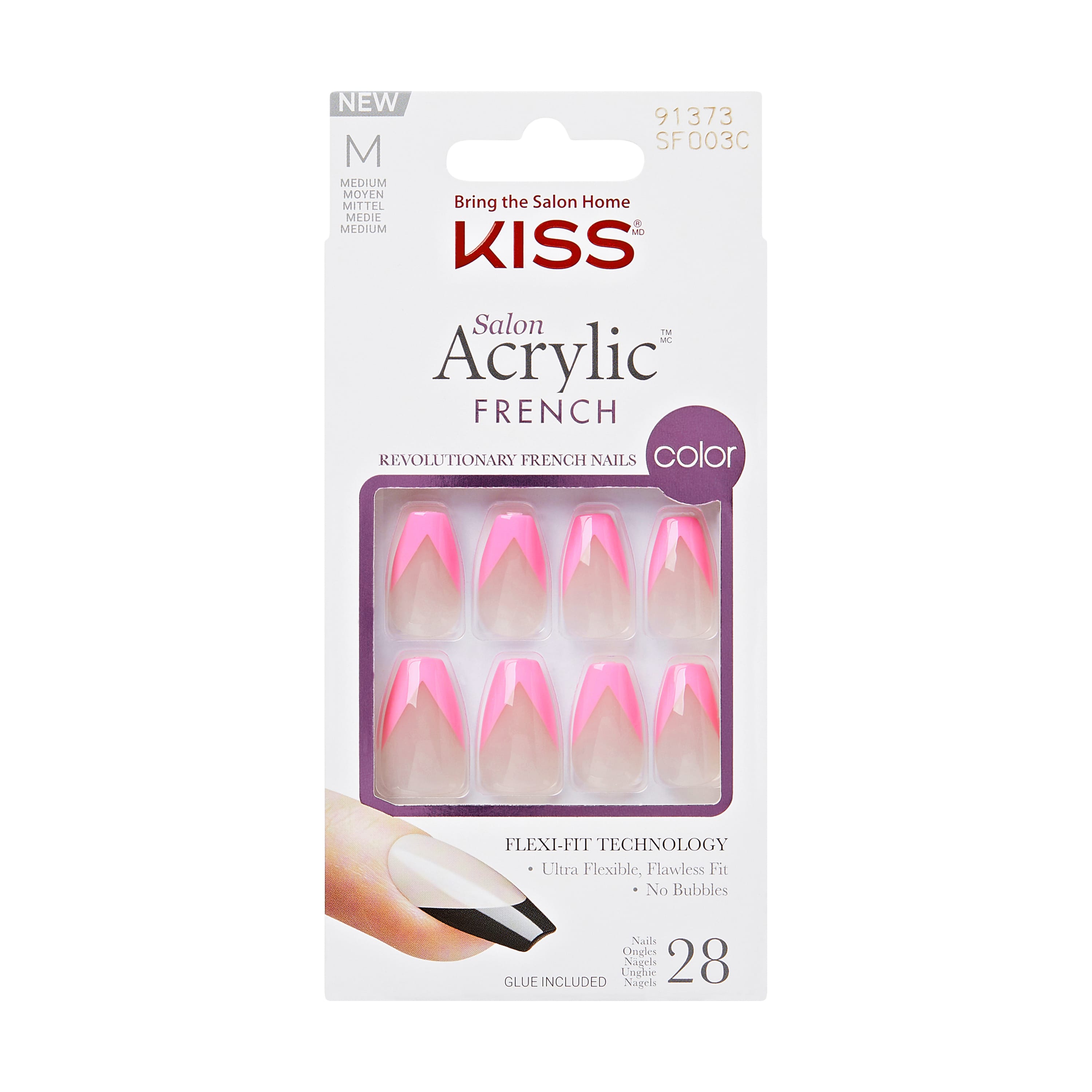 28 miðlungs langar og endingargóðar akrýl gervineglur með bleiku french í pakka. Coffin lögun. Naglalím og naglaþjöl fylgir.