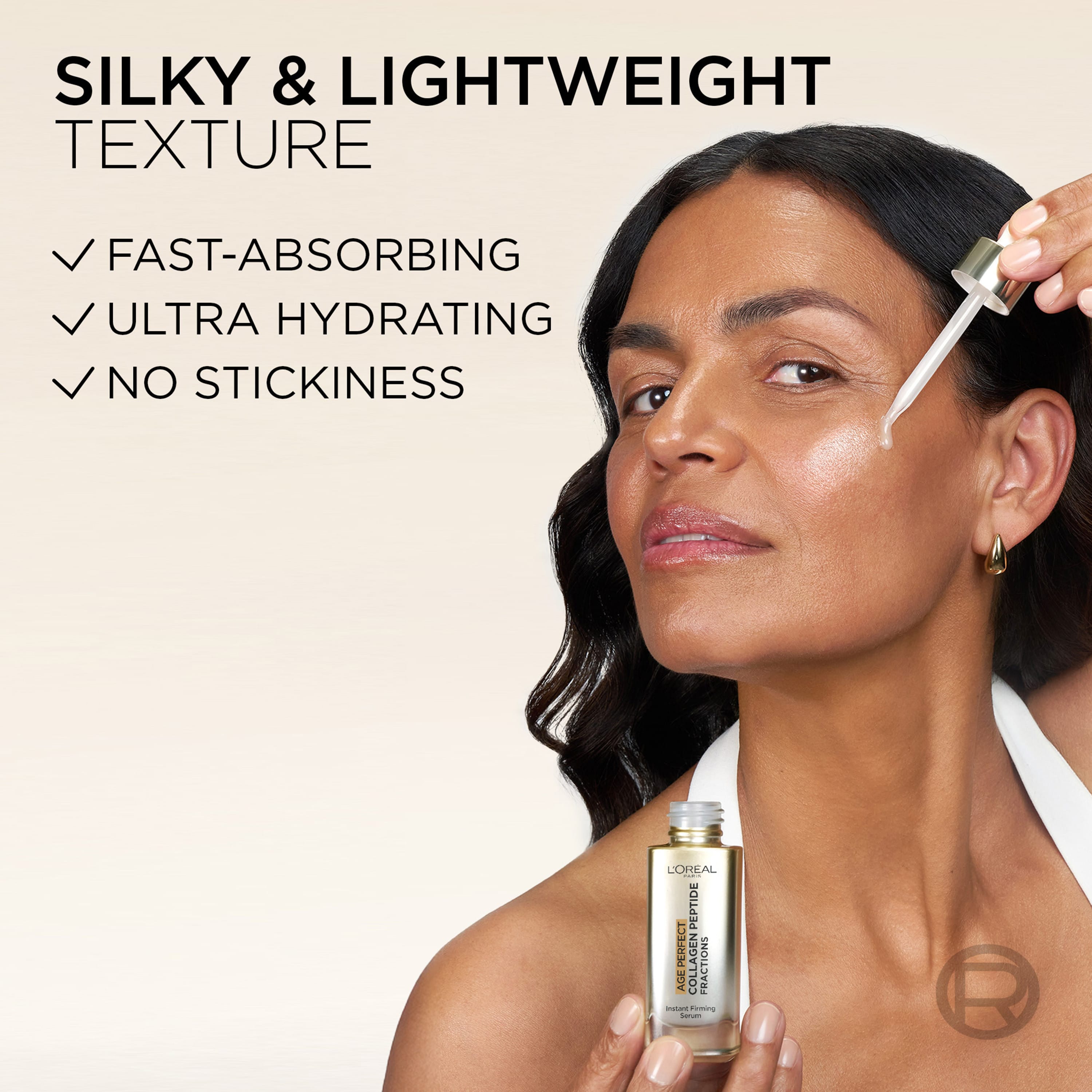 L'Oréal Paris Age Perfect Instant Firming Serum er serum sem er sérstaklega þróað fyrir þroskaða húð. Með aldrinum missum við allt að 30% af kollageni í húðinni, sem hefur áhrif á teygjanleika hennar. Age Perfect línan er hönnuð með þarfir þroskaðrar húðar í huga og hjálpar til að mynda við að vinna gegn öldrunarblettum. Formúlan inniheldur kollagenpeptíð og níasínamíð og vinnur markvisst á merkjum öldrunar.
