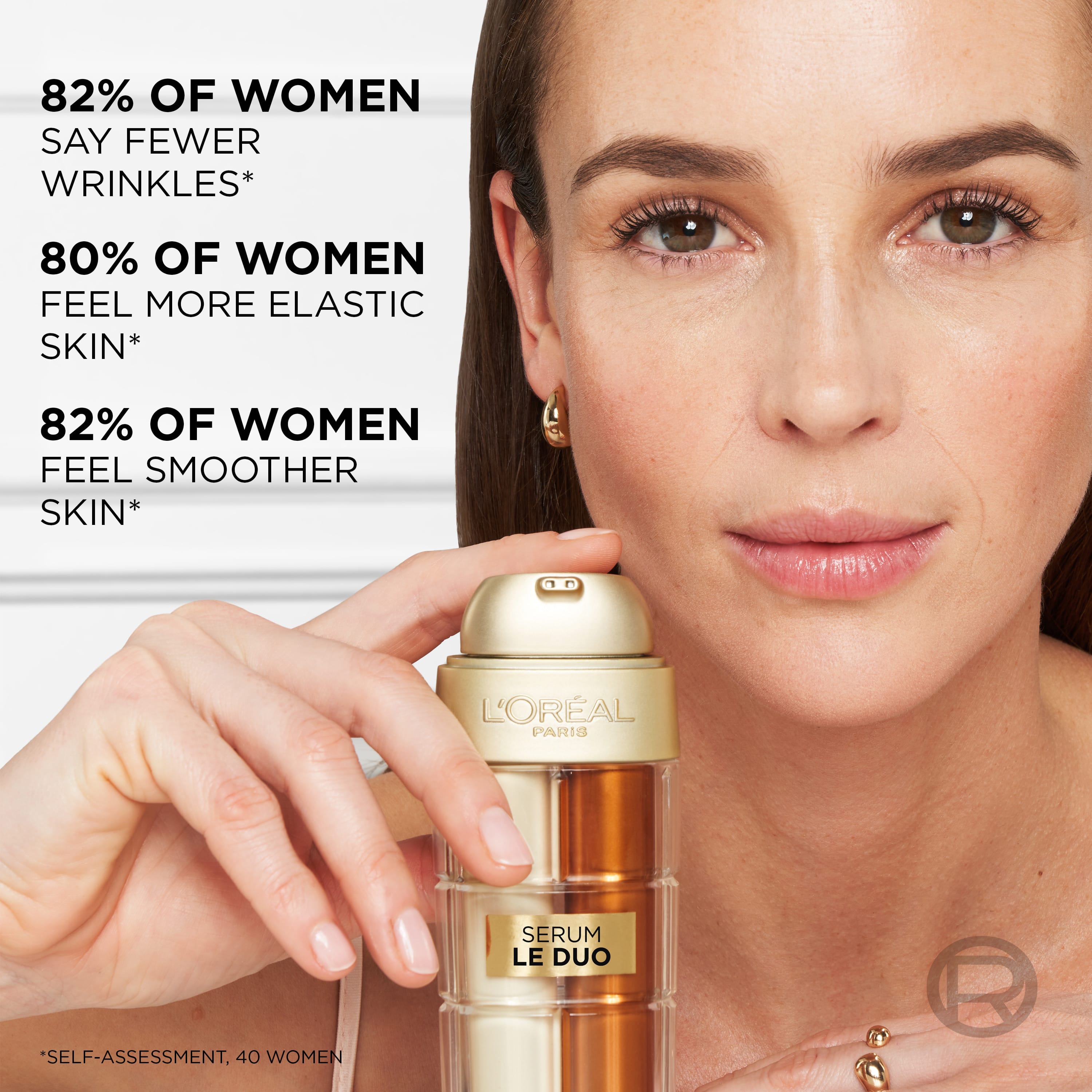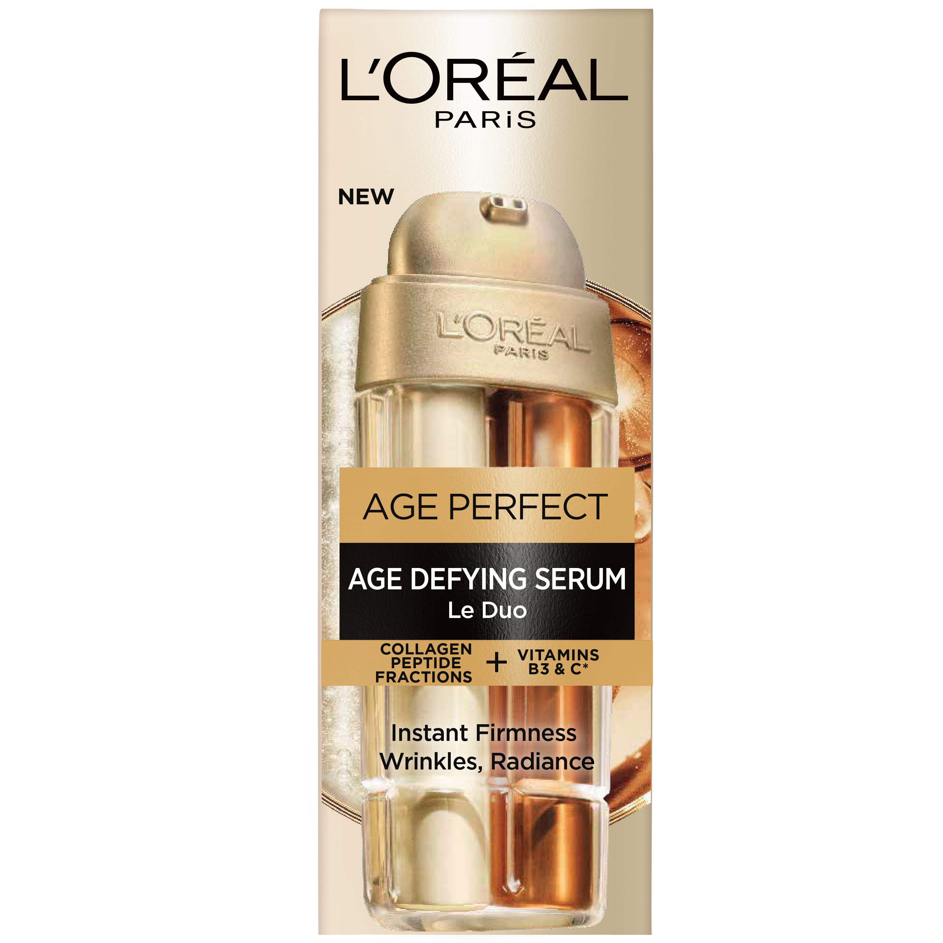 Age Perfect Le Duo Age Defying serum frá L’Oréal Paris er serum sem hentar öllum húðgerðum, þar á meðal viðkvæmri húð. Í fyrsta skipti sameinar L’Oréal Paris virkni tveggja seruma í einu til að draga úr merkjum öldrunar. Formúlurnar eru aðskildar í tveimur hólfum til að tryggja hámarks ferskleika í hverri pumpu. Rjómakennd næringarformúla inniheldur Collagen Peptide-fragment sem styrkja húðina og auka þéttleika hennar, á meðan létt karamellulituð formúlan inniheldur C- og B3-vítamín sem gefa húðinni ljóma og jafna húðlit. Við hverja notkun blandast virku efnin saman í réttri styrkleikablöndu með tvöföldu pumpunni. Niðurstaðan er sýnileg minnkun á öldrunarmerkjum á aðeins sjö dögum með virkni tveggja seruma í einu.