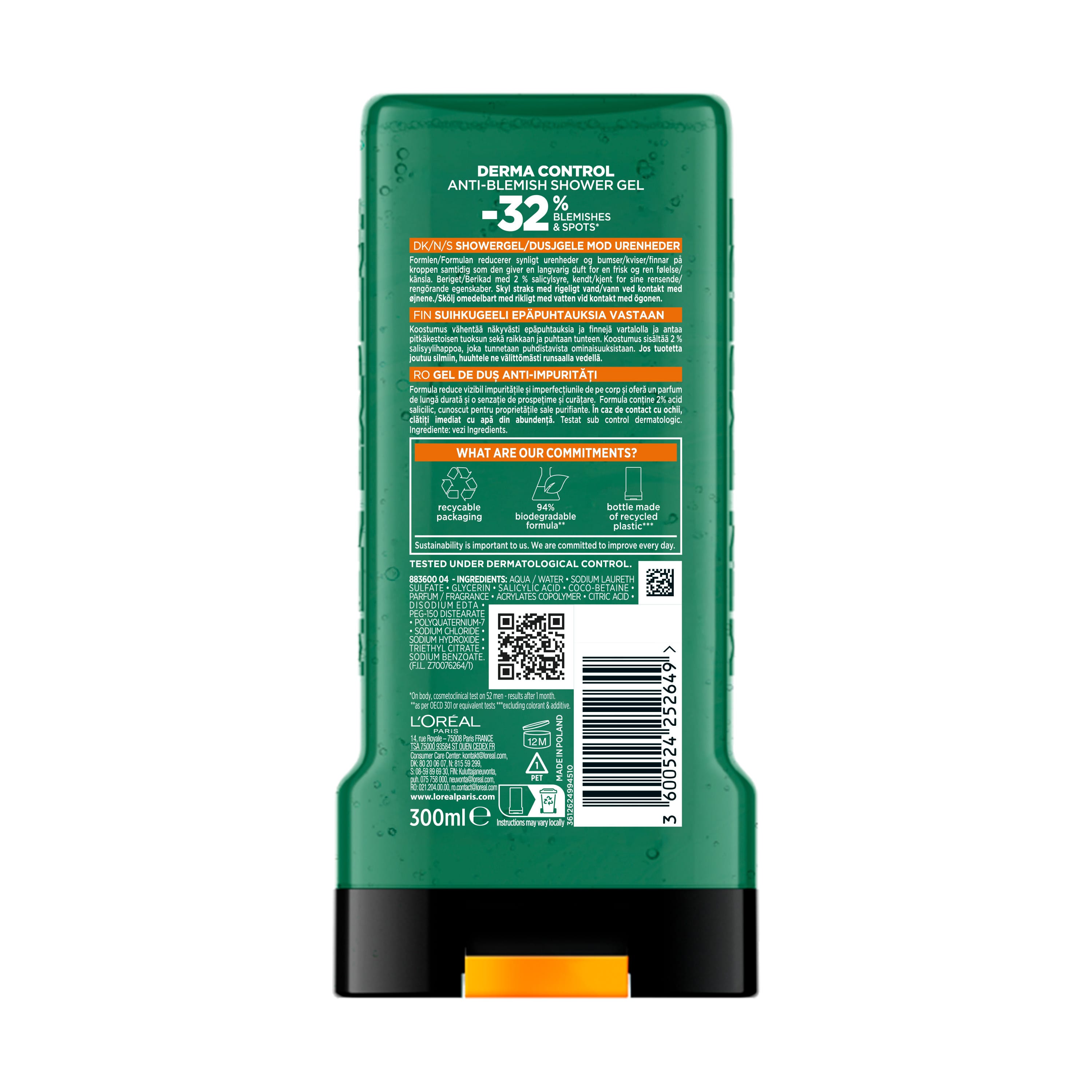 L'Oréal Paris Men Expert Derma Control Shower Gel er öflug sturtusápa fyrir karla. Formúlan hentar þeim sem eru með bólótta húð á líkamanum og inniheldur 2% salisýlsýru.