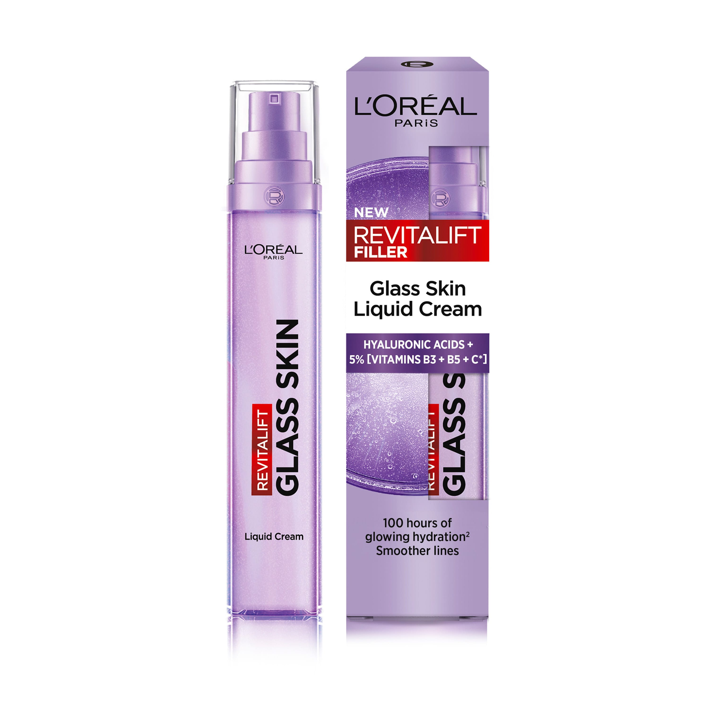 L'Oréal Paris Revitalift Filler Glass Skin Liquid Cream er létt andlitskrem innblásið af kóreska Glass Skin trendinu. Formúlan er rík af hýalúrónsýrum, 5% [B3 + B5 + C vítamínum] og byggir á Fusioglyde™-tækni sem hjálpar vörunni að fara djúpt inn í húðina og veita langvarandi raka. Kremið veitir húðinni samstundis einstakan raka og fallegan ljóma og með tímanum verður húðin þéttari, sléttari og með færri sýnilegar fínar línur.